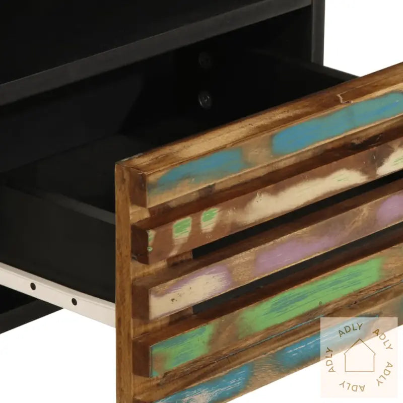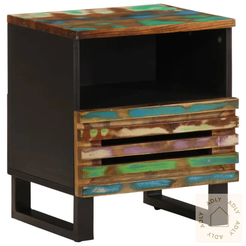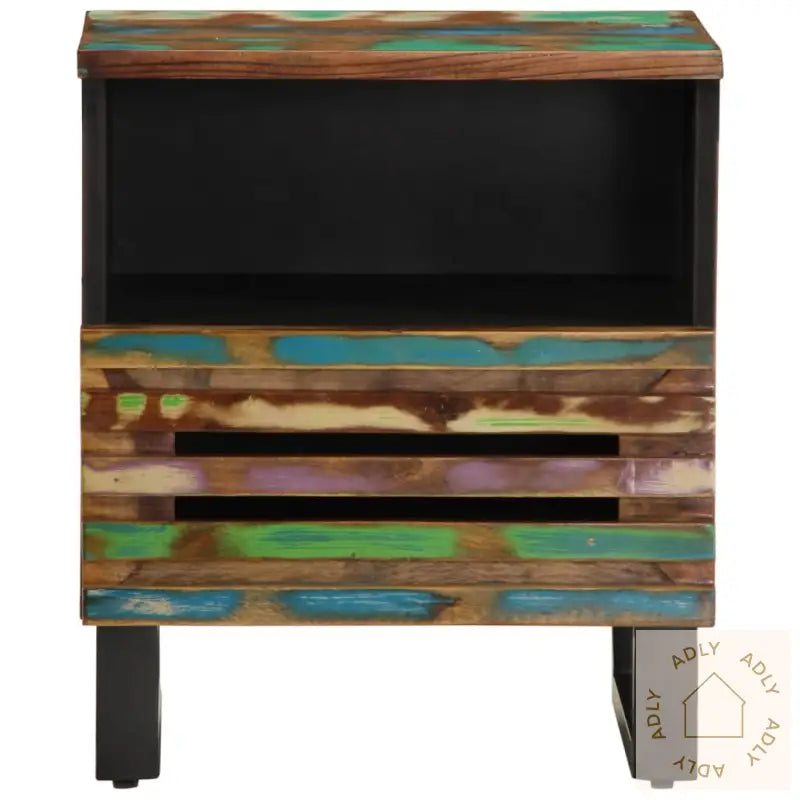 Dette nattbordet i industriell stil, laget av gjenvunnet heltre, er et både dekorativt og praktisk tilskudd til hjemmet ditt. Det har et unikt utseende preget av den varierte fargestrukturen og sjarmerende patina som bare ekte gjenvunnet tre gir – perfekt for deg som ønsker møbler med personlighet.