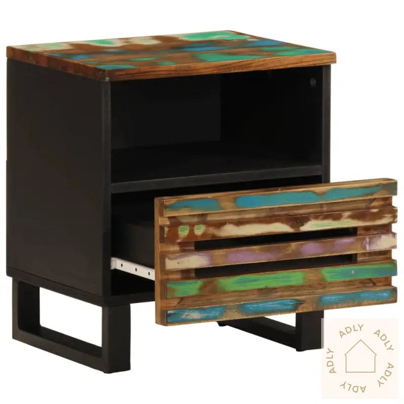 Gjenvunnet heltre: Møbelet er håndlaget av resirkulert tømmer som teak, mangotre, furu og bøk, hentet fra gamle fabrikker, skur og båter. Dette gjør hvert nattbord unikt, med sine egne fargespill og karakteristika. Å velge møbler laget av gjenvunnet heltre er dessuten et miljøvennlig valg.Rikelig med oppbevaringsplass: De åpne hyllene og den praktiske skuffen gir god plass til bøker, blader og små pyntegjenstander du vil ha lett tilgjengelig. Oppbevaringen bidrar til å holde soverommet ryddig, samtidig som designet gir en lun og stilfull atmosfære blant resten av hjemmets møbler.Stabile og holdbare ben: Nattbordet står støtt takket være de solide stålbena. Dette gir ikke bare stabilitet og lang levetid, men tilfører også en ekstra touch av industriell stil.Godt å vite: