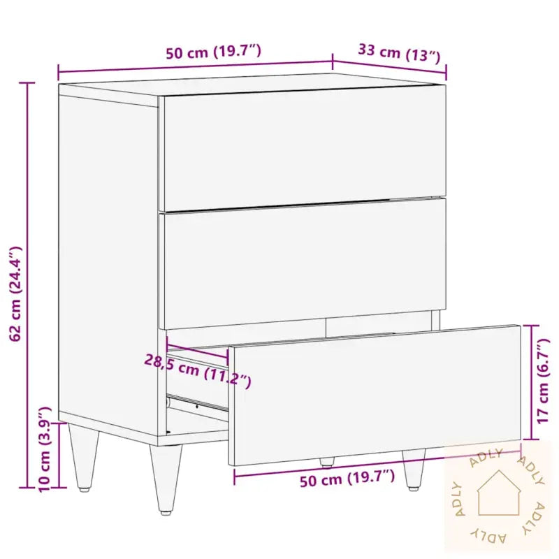 Robust og stabilt materiale: Nattbordet er laget av heltre mango, et slitesterkt og robust tropisk løvtre kjent for sin holdbarhet i møbelproduksjon. De naturlig varierende trekornene gir hvert enkelt møbel sin helt unike karakter og sørger for at ingen blir helt like.Rikelig med lagringsplass: Med tre romslige skuffer får du super oppbevaringsplass til bøker, blader, briller og alt annet du vil ha nært sengen. Du holder enkelt oversikt og har tingene dine tilgjengelig, slik at du får en mer avslappet kveld og morgen.Allsidig bruk: Dette møbelet passer ikke bare som nattbord på soverommet – bruk det gjerne som sidebord i stuen, i gangen, som ekstra oppbevaringsplass eller integrert sammen med hagemøbler under tak. Det tilpasser seg enkelt behovene dine, og gir deg fleksible løsninger for hjemmet.Treben: Stødige ben av tre gir både stabilitet og sikkerhet. Møbelet står støtt og gir deg ro i hverdagen.Godt å vite: