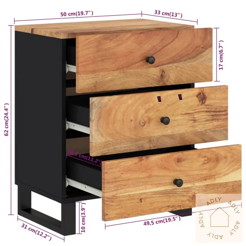 Heltre akasie: Laget av ekte heltre akasie, som er kjent for sin naturlige skjønnhet og holdbarhet. Akasietre er et robust tropisk løvtre med en tett struktur, noe som gjør det svært motstandsdyktig og perfekt for både hagemøbler og interiørmøbler.Rikelig med lagringsplass: Med tre romslige skuffer får du rikelig med plass til å organisere alle slags nødvendigheter. Du har alt du trenger for hånden, samtidig som rommet ser ryddig ut.Solid topp: Den solide toppen er superpraktisk – her kan du enkelt plassere kaffekoppen, favorittbøkene dine eller pyntegjenstander uten å bekymre deg for stabiliteten.Metallben: Metallbena gir ikke bare et moderne, industrielt utseende, men lover også styrke og god støtte til møbelet over tid.Advarsel: