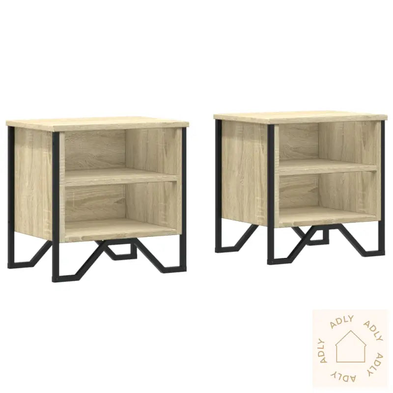Holdbart materiale: Nattbordene er laget av konstruert treverk i høy kvalitet, noe som gir en solid konstruksjon. Overflaten er glatt, slitesterk og står godt imot fuktighet, så du kan forvente lang levetid selv ved daglig bruk.Smidig oppbevaring: Under bordplaten finner du smart oppbevaringsplass – ideelt for å organisere småting som bøker, fjernkontroller eller personlige gjenstander du vil ha lett tilgjengelig ved sengen.Solid bordplate: Den solide bordplaten gir rikelig plass til alt du vil ha nært – enten det er et glass vann, lampen din, dekorative bilder eller grønne potteplanter. Du får en trygg flate med ekstra stabilitet, så du ikke trenger bekymre deg for at ting velter.Enkel å holde ren: Med den glatte overflaten i sonoma eik er det veldig enkelt å vedlikeholde disse nattbordene. En fuktig klut holder bordene pene og freshe uten mye styr.Farge: sonoma eikMaterialer: konstruert tre, metallMål: 40 x 30 x 40 cm (B x D x H)Maksimal lastekapasitet (totalt): 70 kgMontering kreves: jaLeveransen inneholder:2 x nattbord