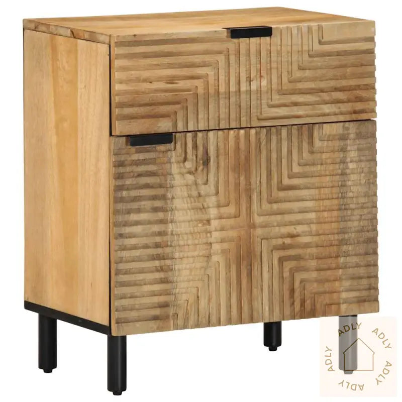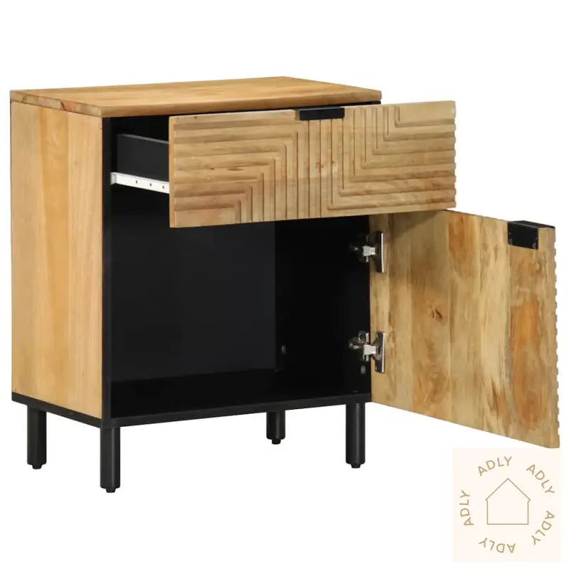 Robust og stabilt materiale: Heltre mango er kjent for sine sterke og holdbare egenskaper, og blir ofte valgt til møbler på grunn av sin unike struktur og vakre utseende. Med en flott finish og markert CNC-front får du et nattbord som skiller seg ut på både stil og kvalitet.Rikelig med lagringsplass: Dette nattbordet har flere romslige hyller og rom, slik at du enkelt kan oppbevare bøker, blader, briller eller annet tilbehør du trenger lett tilgjengelig ved sengen. Alt holder seg organisert og er alltid innen rekkevidde.Allsidig bruk: Selv om det er ideelt som nattbord på soverommet, kan det også settes inn som sidebord i stuen eller brukes som ekstra lagringsplass andre steder i huset. Det elegante designet gjør at det glir rett inn sammen med andre møbler til hjemmet.Treben: De solide beina i tre gir nattbordet ekstra stabilitet og sørger for trygg plassering uansett underlag, samtidig som de løfter designet til et nytt nivå.Møbelet leveres i en flott brunfarge, og kombinerer heltre mango med konstruert tre og metall, noe som gir en spennende kontrast og forsterker den moderne følelsen. Målene er 50 x 33 x 60 cm (B x D x H), og de 10 cm høye beina gjør det lett å holde rent under nattbordet.