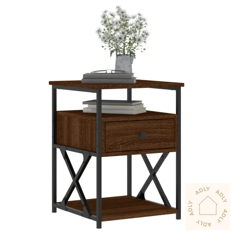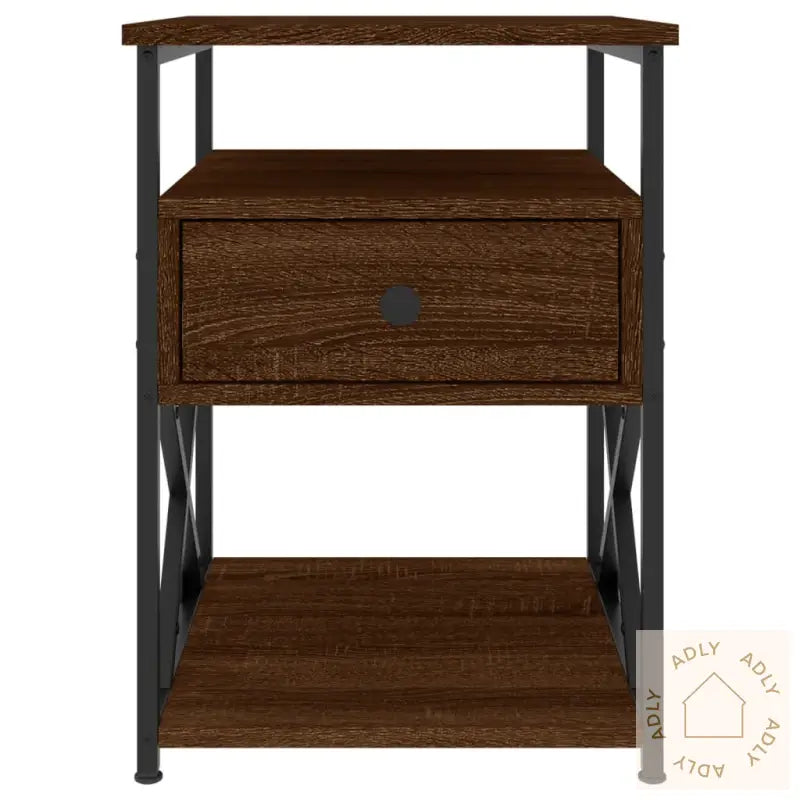 Slitesterkt materiale: Dette nattbordet er laget av konstruert treverk, kjent for sin høye kvalitet, jevne overflate og gode motstand mot fuktighet. Materialet gir møbelet en lang levetid og gjør det enkelt å holde rent – bare tørk over med en fuktig klut.Stabil ramme: Rammen i jern gjør nattbordet ekstra solid og sikrer god stabilitet. Samspillet mellom treverk og metall gir også nattbordet et moderne preg.Rikelig med lagringsplass: Du får god plass til å oppbevare alt fra bøker og ladere til andre hverdagslige småting. Alt holder seg organisert og lett tilgjengelig ved siden av sengen eller sofaen.Visningsfunksjon: Topplaten i brun eik er perfekt for å vise frem favorittbilder, planter eller små dekorasjoner som gir rommet ditt et personlig preg.Justerbare føtter: De fire justerbare føttene med plast beskytter gulvet og sørger for at nattbordet alltid står stødig – selv på ujevnt underlag. Dette gjør det ekstra praktisk og brukervennlig sammenlignet med mange andre typer møbler til hjemmet.Advarsel: