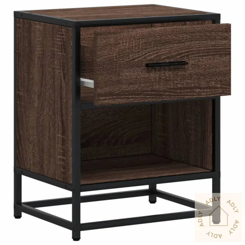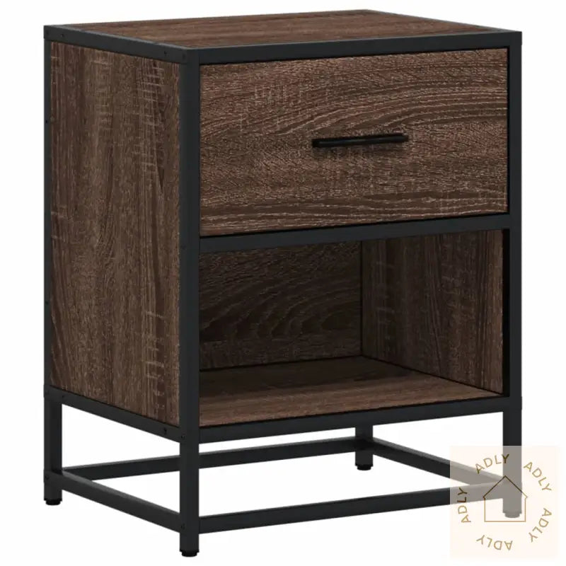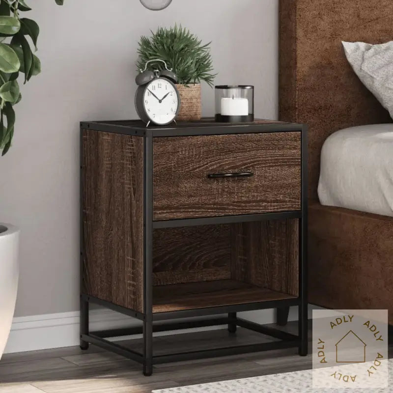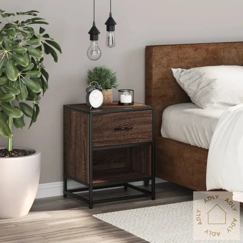 Holdbart materiale: Dette nattbordet er laget av konstruert tre av høy kvalitet med stål, noe som gir god styrke, stabilitet og motstandsdyktighet mot fuktighet. Den glatte overflaten gjør det også ekstra slitesterkt, perfekt for både hverdagsbruk og som del av dine favorittmøbler til hjemmet.Rikelig med oppbevaringsplass: Takket være en romslig skuff og et åpent rom får du nok lagringsplass til bøker, telefon, fjernkontroller eller andre småting du ønsker å ha lett tilgjengelig – alt innen rekkevidde og pent organisert.Enkelt å vedlikeholde: Den slette finishen på overflaten gjør hyllen enkel å holde ren. Bare tørk lett over med en fuktig klut når det trengs, så ser nattbordet like flott ut over tid.Robust bordplate: Bordplaten er solid og tåler vekten av pyntegjenstander, bilder, lamper eller grønne planter. Med sitt diskré uttrykk i brun eik bidrar den til å løfte inntrykket av både soverom og stue.Advarsel: