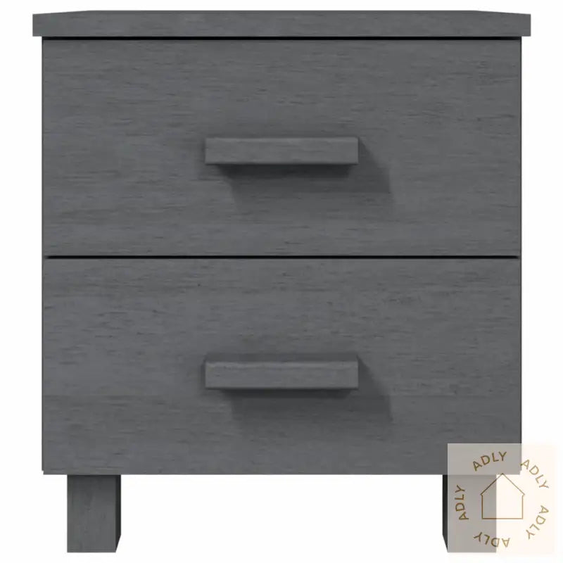 Farge: mørkegråMaterialer: heltre furu, MDFSamlet mål: 40 x 35 x 44,5 cm (B x D x H)Ytre mål skuff: 38,5 x 17,5 cm (B x H)Indre mål skuff: 30 x 28,5 x 14 cm (B x D x H)Med 2 skuffer med trehåndtakUtvalg: HAMARMontering kreves: jaLeveransen inneholder:2 x nattbord