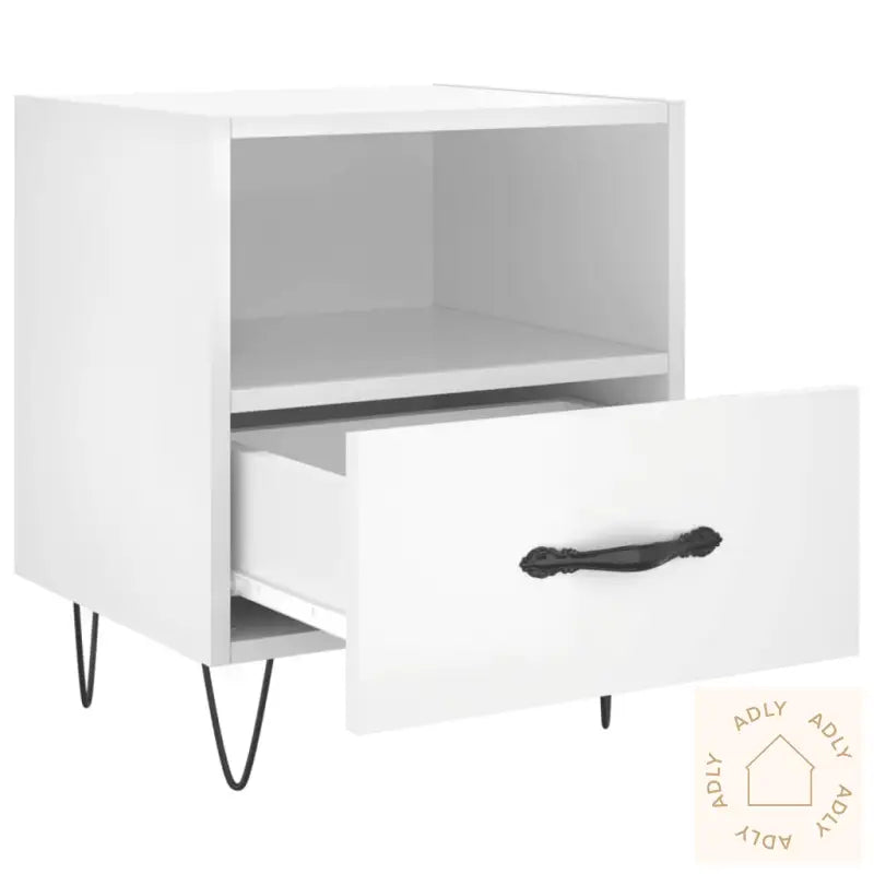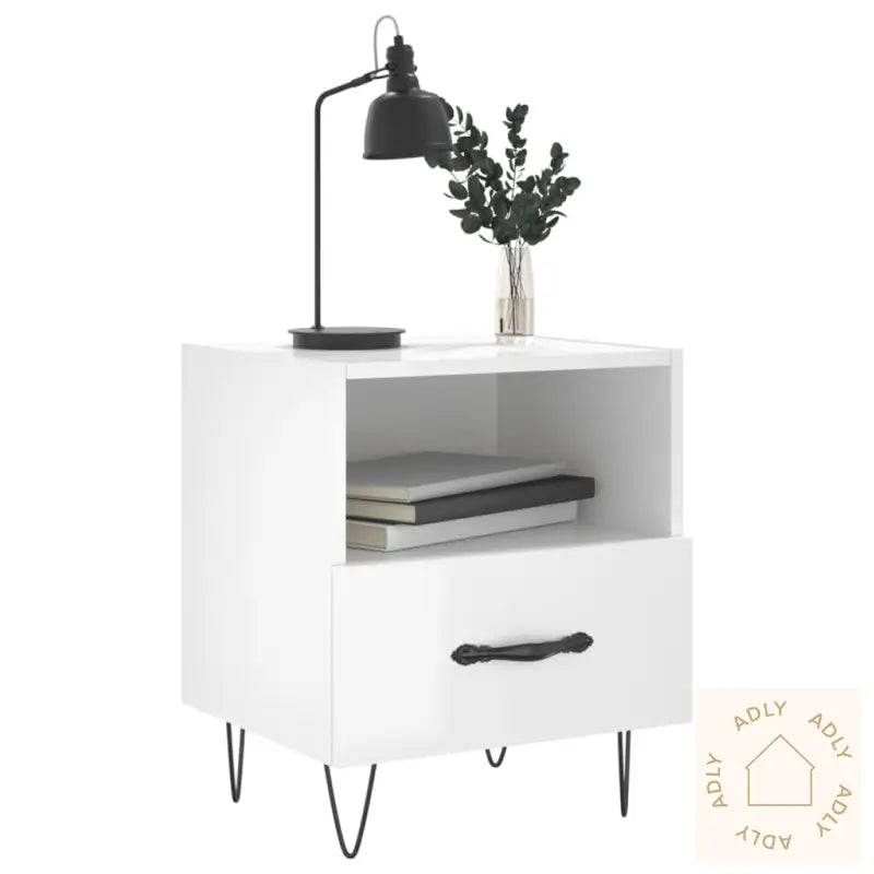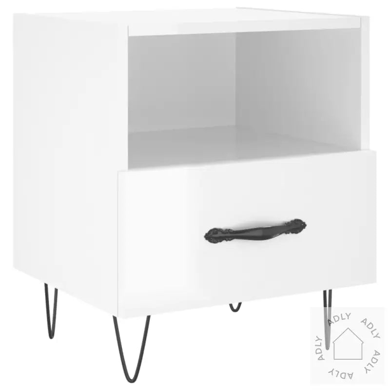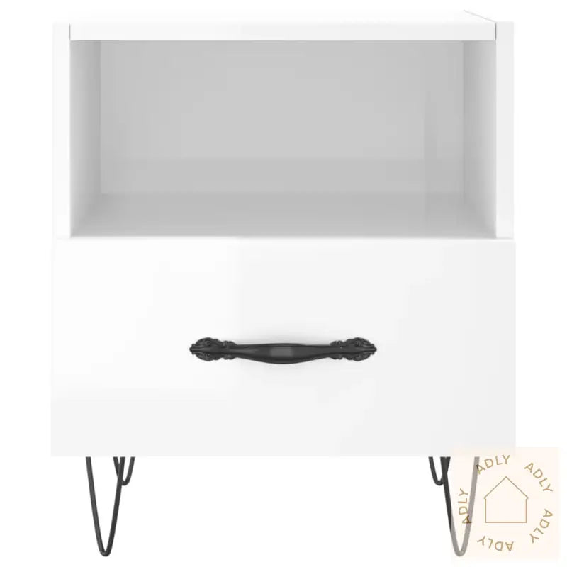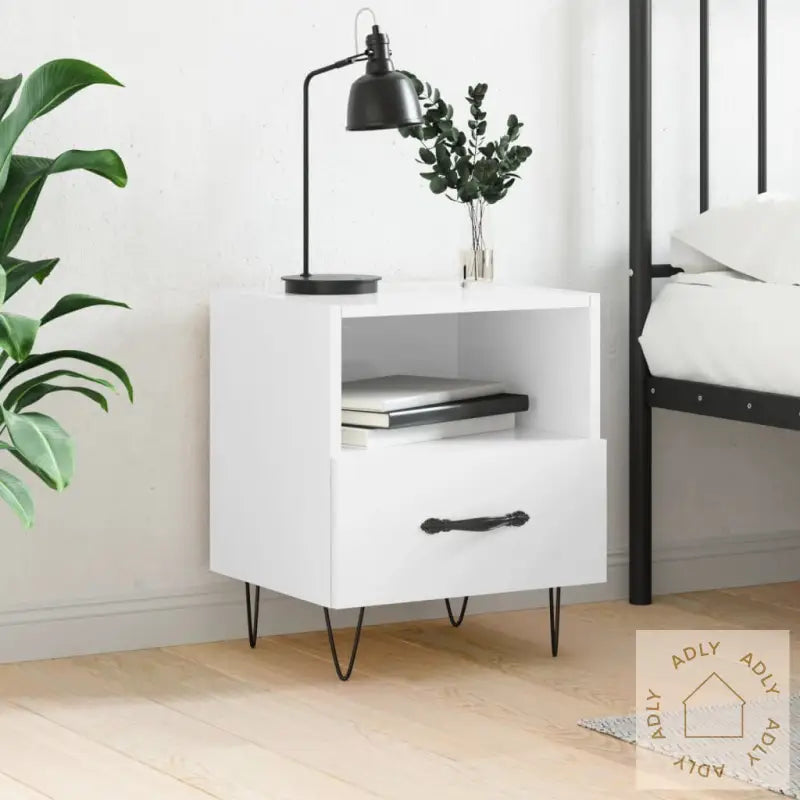 Slitesterkt materiale: Nattbordet er laget av konstruert tre av høy kvalitet med glatt finish. Dette materialet gir ikke bare et elegant utseende, men også styrke, stabilitet og god motstand mot fukt – perfekt for daglig bruk i soverommet.Romslig lagringsplass: Takket være den smarte oppdelingen får du et åpent rom og en skuff. Det gir deg en romslig lagringsplass hvor du enkelt kan holde bøker, fjernkontroller, ladere eller andre småting organisert og innen rekkevidde, slik at overflaten alltid holder seg ryddig.Visningsfunksjon: Toppen på nattbordet er ideell for å vise frem dine favorittbilder, små dekorasjoner eller en fin blomsterbukett, som gir et personlig preg til soverommet og løfter stemningen i rommet.Metallføtter: De solide metallføttene gir nattbordet ekstra stabilitet, samtidig som de tilfører en moderne vri til interiøret. Dette gjør det til et smart og stilig valg blant andre møbler til hjemmet.Farge: høyglans hvitMaterialer: konstruert tre, jernMål: 40 x 35 x 47,5 cm (B x D x H)Montering kreves: ja