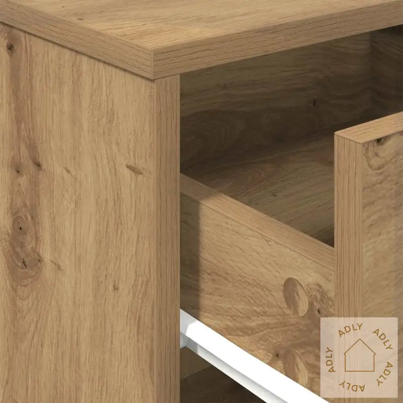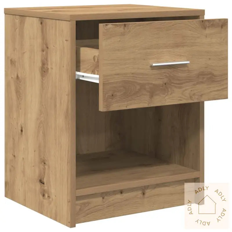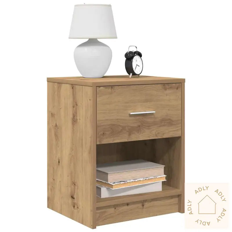 Stabilt og holdbart: Skapene er laget av konstruert tre med jevn overflate som motstår fukt, vridning og sprekker. Dette gjør møblene til et solid alternativ for daglig bruk hjemme, med lang levetid.God oppbevaringsplass: Med en romslig skuff og et åpent rom får du mye plass til å organisere bøker, magasiner og personlige småting. Rommet under bidrar til at soverommet holder seg ryddig uten rot på nattbordet.Smart design for enkel tilgang: Den praktiske høyden gjør det lett å nå ting fra sengen, og håndtaket på skuffen lar deg åpne den jevnt og stille. Dette gjør nattbordet lett å bruke, uansett behov.Lett å holde rent: Den glatte overflaten av konstruert tre i artisan eik gjør at nattbordet kan tørkes over med en fuktig klut, så det alltid ser innbydende ut med minimalt vedlikehold.Advarsel: