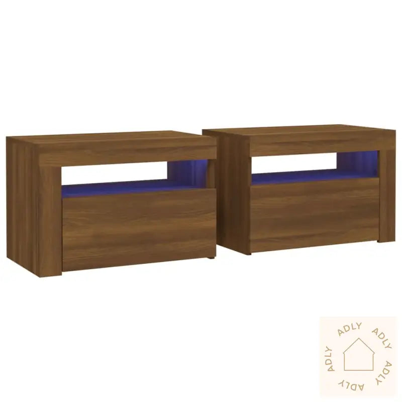 Disse nattbordene i brun eik har et moderne og praktisk design som gjør dem til et skikkelig blikkfang blant dine møbler til hjemmet. Den stilrene overflaten og trendy looken kombineres med smarte løsninger for oppbevaring og stemningsfull belysning – perfekt om du vil gi soverommet litt ekstra atmosfære.