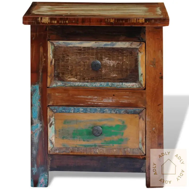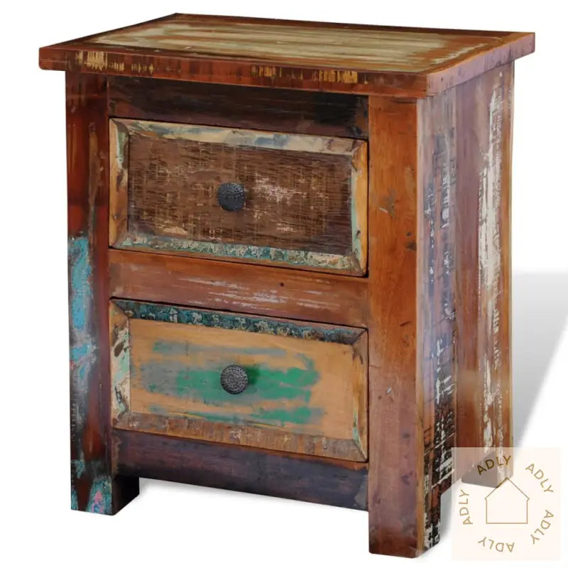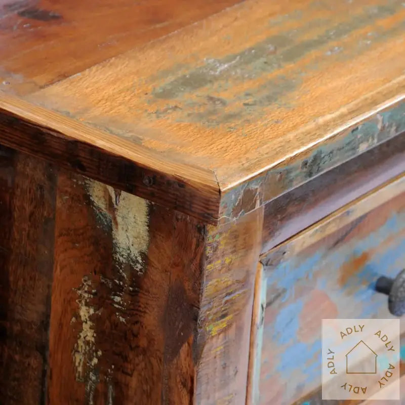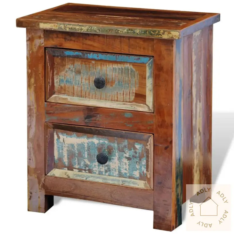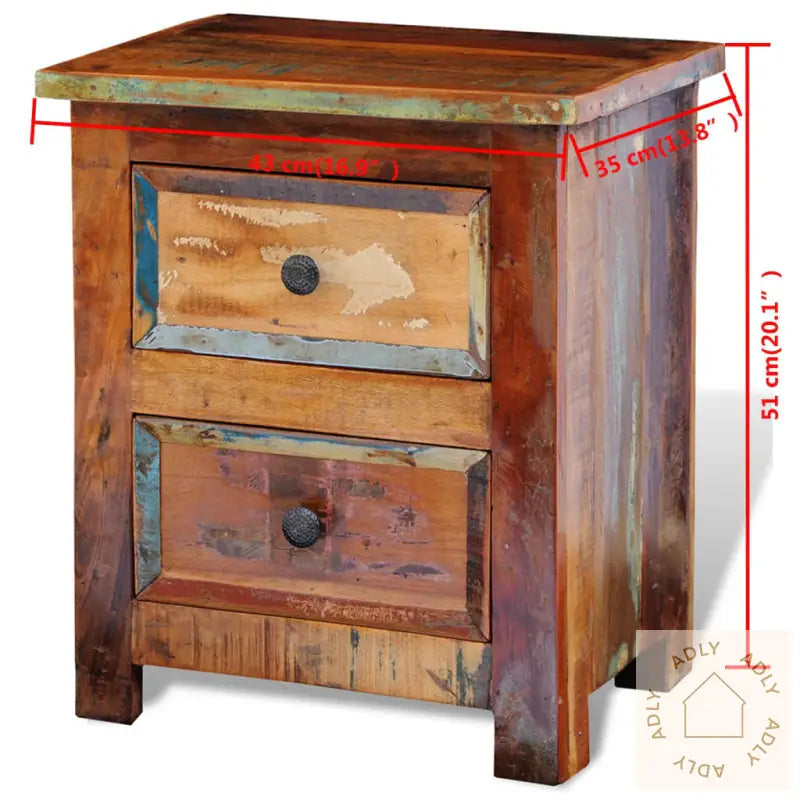 Dette antikke sideskapet i gjenvunnet heltre med 2 skuffer gir deg godt med lagringsplass, slik at det blir enklere å holde orden på tingene dine. Den solide topplaten er perfekt til å sette vaser, toalettsaker eller små dekorative elementer – og løfter uttrykket i rommet.