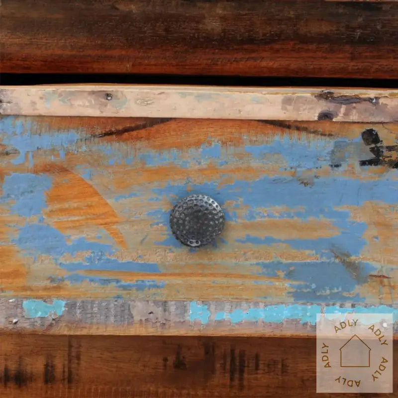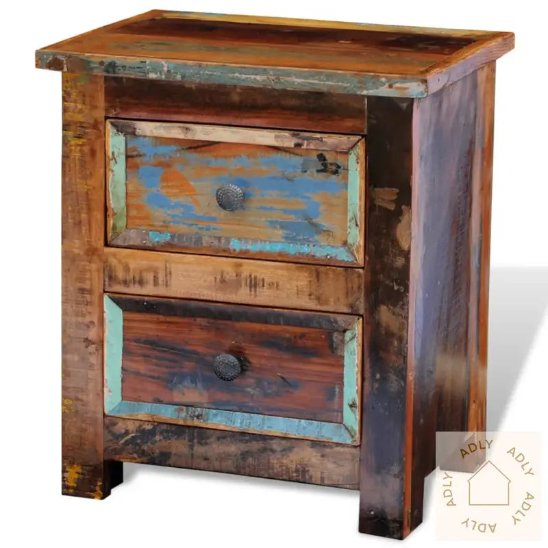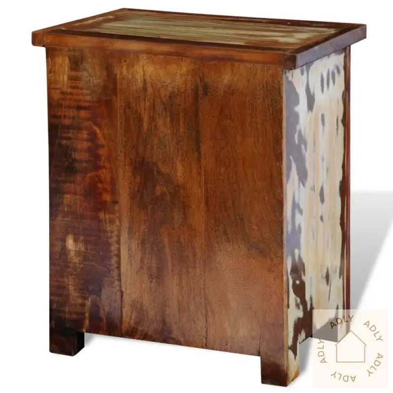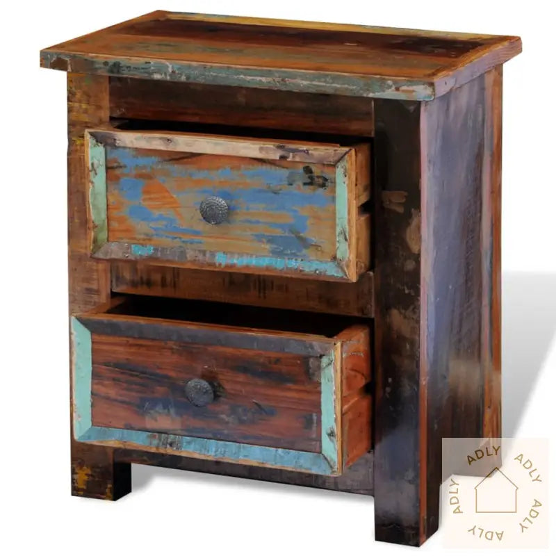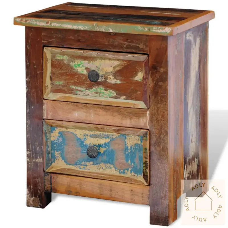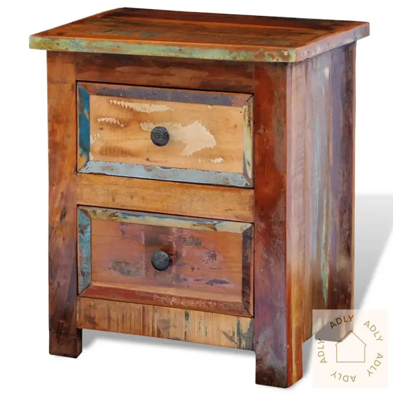 Dette antikke sideskapet i gjenvunnet heltre med 2 skuffer gir deg godt med lagringsplass, slik at det blir enklere å holde orden på tingene dine. Den solide topplaten er perfekt til å sette vaser, toalettsaker eller små dekorative elementer – og løfter uttrykket i rommet.