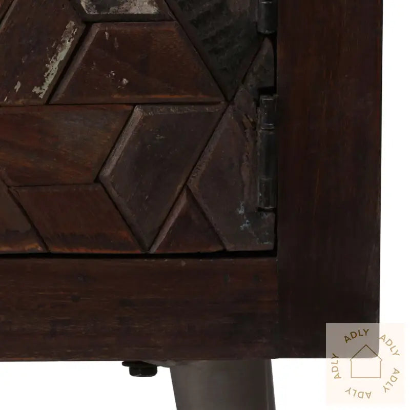 Materialer: gjenvunnet heltre + stålbeinMål: 40 x 30 x 50 cm (B x D x H)Vakkert, innfelt mønster på fremsiden av skapdøren og skuffenMed 1 skuff og 1 skapPolert, malt og lakkertEnkel montering