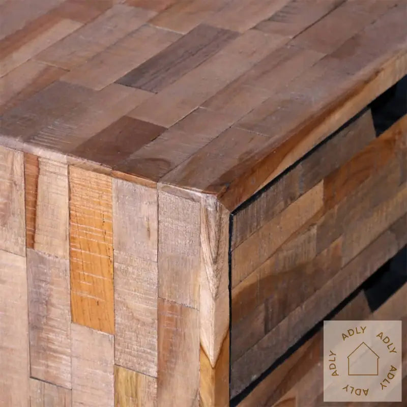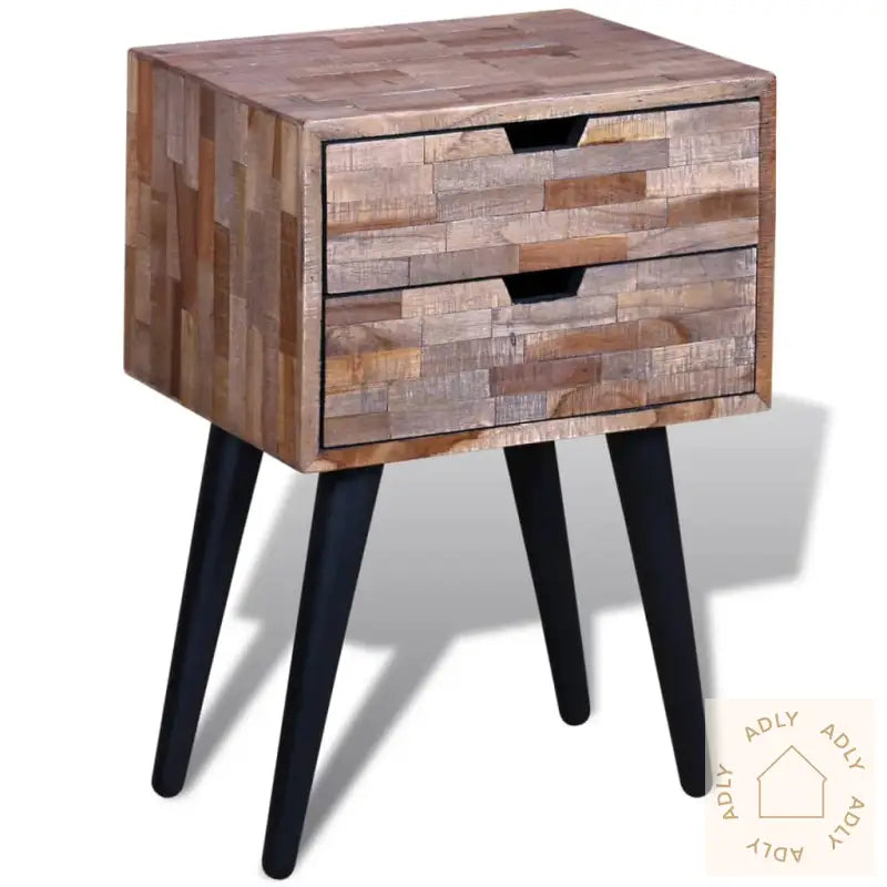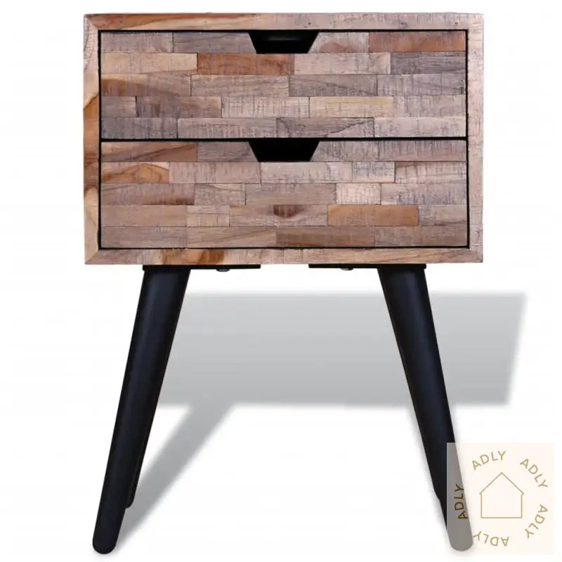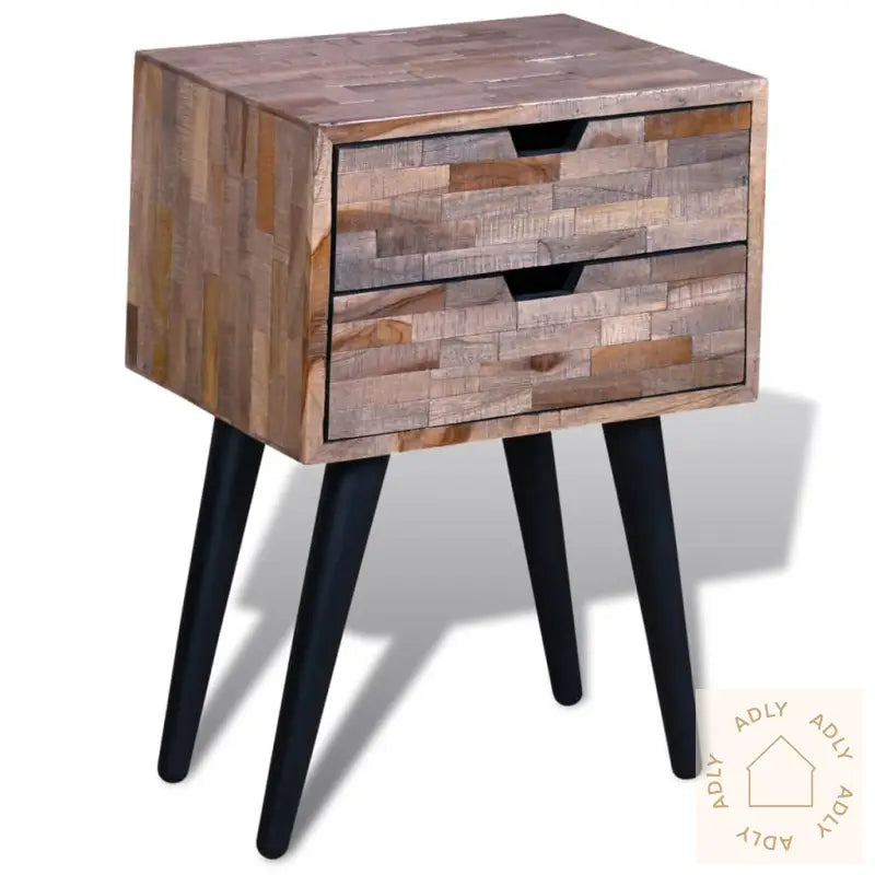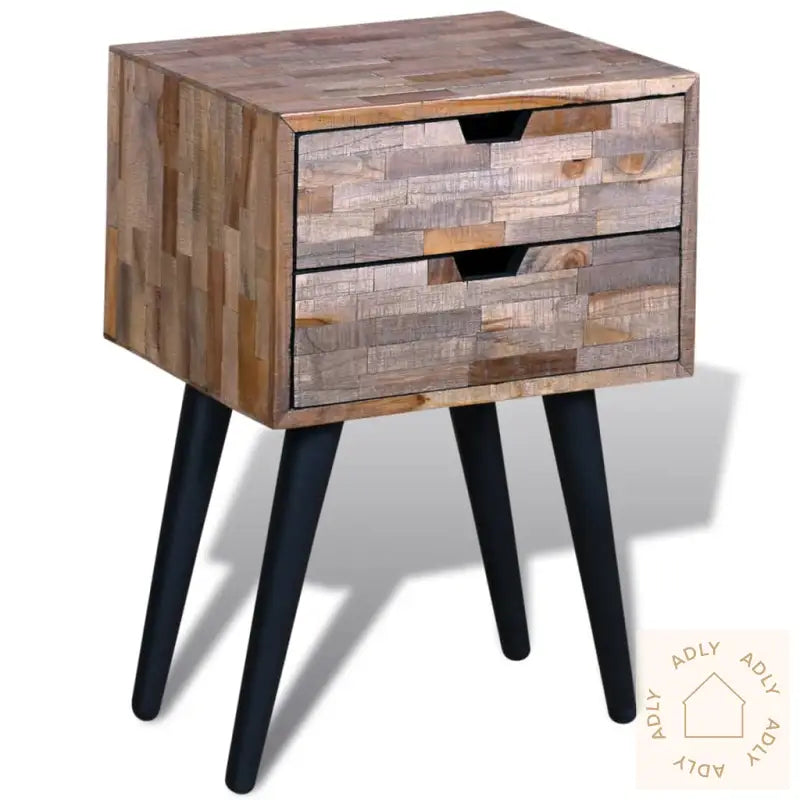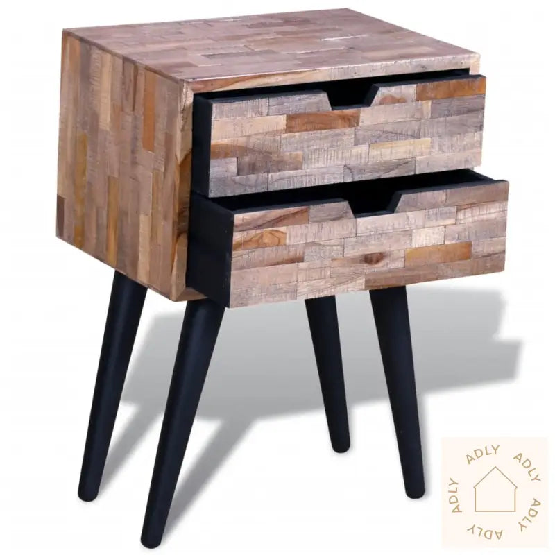 Dette gammeldagse sengeskapet laget av gjenvunnet teak gir både stil og funksjonalitet til hjemmet. Med to romslige skuffer er det superpraktisk for oppbevaring, og passer like godt som nattbord ved sengen, som et konsollkabinett i stuen, eller som sidebord andre steder i huset. Det er et virkelig flott tilskudd til soverommet, eller hvor du ellers trenger ekstra oppbevaringsplass.