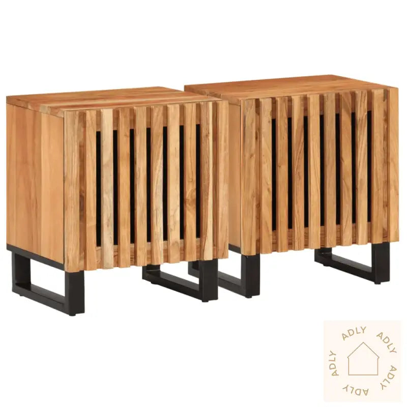 Heltre akasie: Heltre akasie gir nattbordene et naturlig og eksklusivt preg. Dette materialet er spesielt ettertraktet for sin styrke og langvarige holdbarhet, noe som gjør det ideelt for hagemøbler og solide innemøbler. De unike kornmønstrene og varme fargenyansene i heltre akasie gjør hvert nattbord unikt og tilfører personlighet til rommet.Rikelig med oppbevaringsplass: Takket være åpne hyller byr nattbordet på masse plass til å organisere bøker, blader, fjernkontroller og pyntegjenstander – her har du alt innen rekkevidde uten at det blir rotete.Stabile og holdbare ben: De robuste bena i stål gir ekstra stabilitet og sørger for at nattbordene står stødig på gulvet. Du kan trygt plassere både lamper og dekorasjoner på toppen, og føle deg sikker på at møblene tåler daglig bruk.Materialer: heltre akasie, konstruert tre, stålMål: 40 x 34 x 46 cm (L x B x H)Med 1 dør for beskyttet oppbevaringMontering kreves: jaLeveransen inneholder:2 x nattbord
