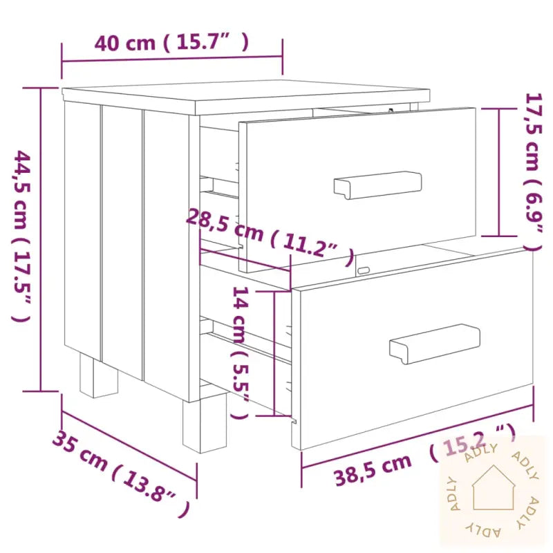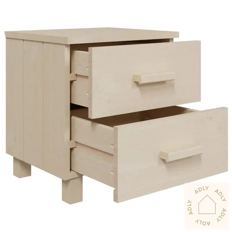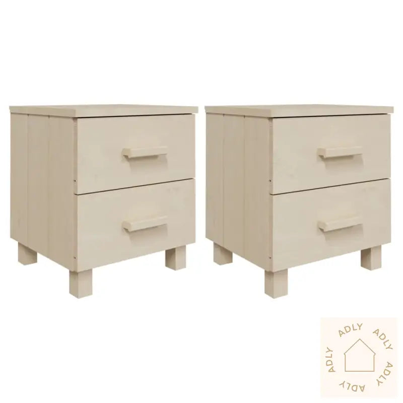 Nattbordene er laget av heltre furu i kombinasjon med solid MDF, noe som sikrer høy stabilitet og lang levetid – smart for deg som vil investere i kvalitetsmøbler. Hver enhet har to romslige skuffer med trehåndtak, slik at du enkelt kan holde orden på alt fra magasiner og bøker til fjernkontroller og alt mulig smått. Mål skuff gjør det lett å planlegge oppbevaringsbehovene dine – både ytre og indre mål står oppført, så du vet akkurat hva som får plass.