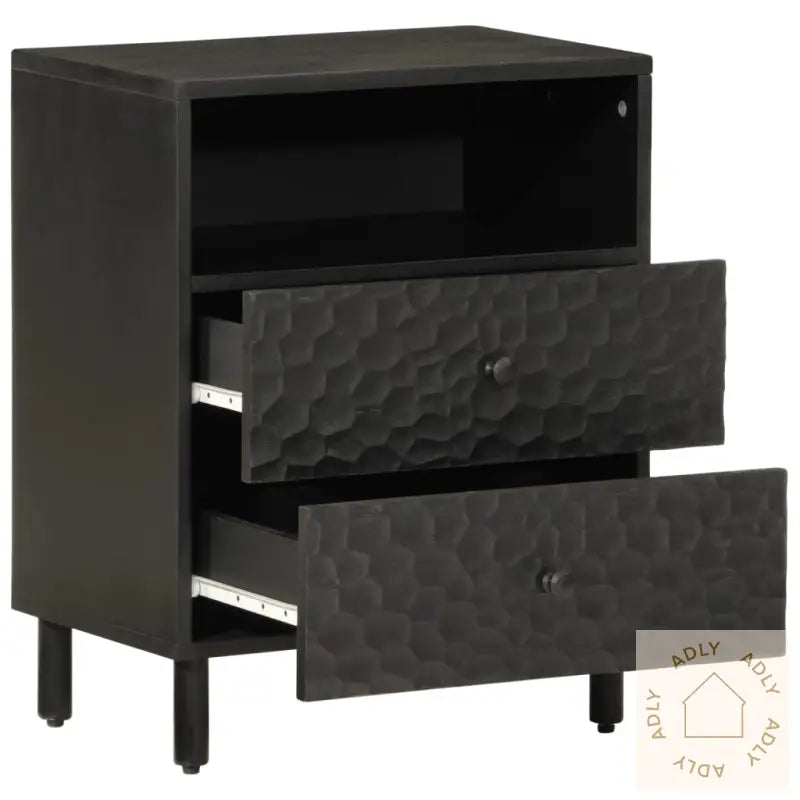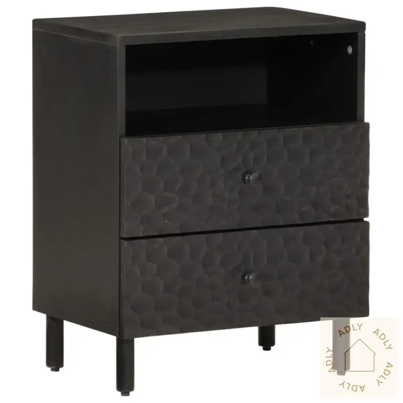 Heltre mango: Heltre mango er et sterkt, tropisk løvtre kjent for sin imponerende slitestyrke og lange levetid, og brukes ofte innen møbler til hjemmet. De unike og naturlige trekornene gjør hvert eneste nattbord helt unikt, med sitt eget særpreg. Skapet er laget av heltre mango med en elegant svart finish, så du får et robust møbel som tåler daglig bruk år etter år.God lagringsplass: Med to romslige skuffer og én åpen hylle, gir nattbordet deg rikelig med plass til å organisere bøker, småting eller hverdagslige nødvendigheter. Du har alltid det viktigste lett tilgjengelig fra sengen.Stabil topp: Toppen av skapet gir en solid flate hvor du kan stille ut dekorgjenstander, bilderammer eller potteplanter. Dette gir deg muligheten til å personliggjøre rommet og vise frem det du liker best.Jernben: Understellet i jern sørger for at nattbordet står stødig og stabilt. Jernbenene bidrar også til et moderne og stilig uttrykk, samtidig som det forlenger levetiden på møbelet.Advarsel: