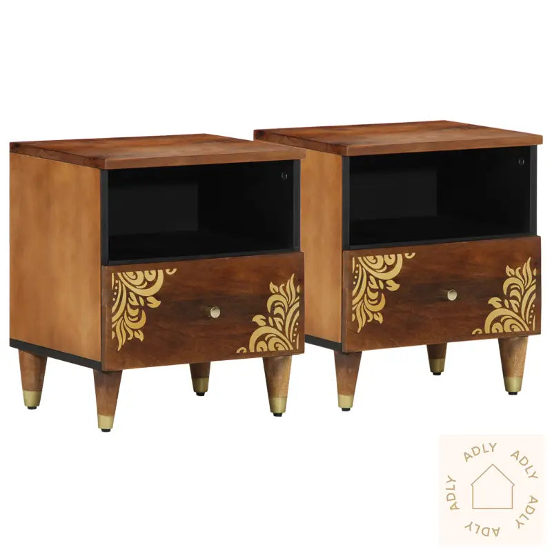 Dette nattbordsettet har et moderne og elegant utseende som umiddelbart løfter atmosfæren på ethvert soverom. Den varme honningbrune finishen sammen med vakre, dekorative blomsterinnlegg gir møblene et sofistikert preg, samtidig som de tilfører rommet en personlig stil som mange ser etter når de velger nye møbler til hjemmet. Det er ikke bare et praktisk valg for lagring av bøker og andre nødvendigheter – nattbordene gjør det også enkelt å holde personlige ting organisert og alltid innen rekkevidde.