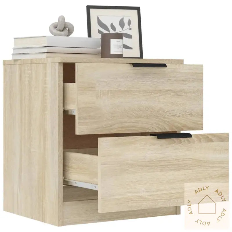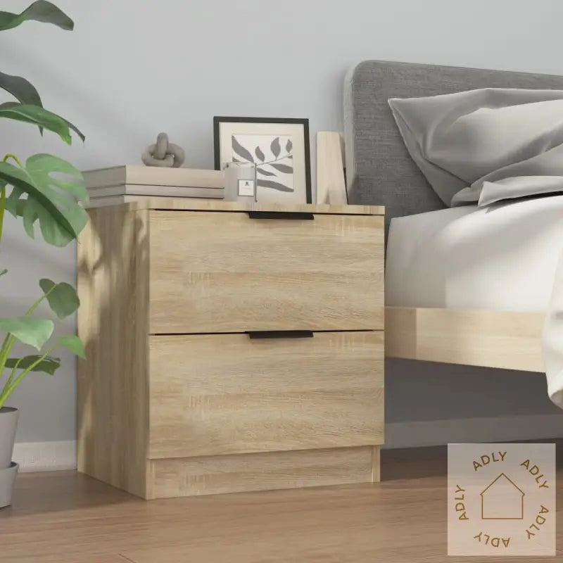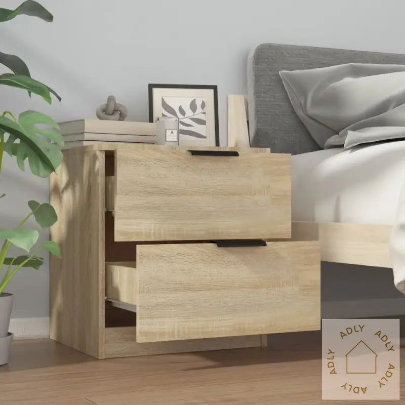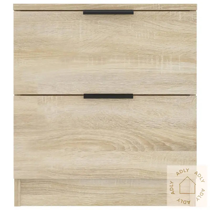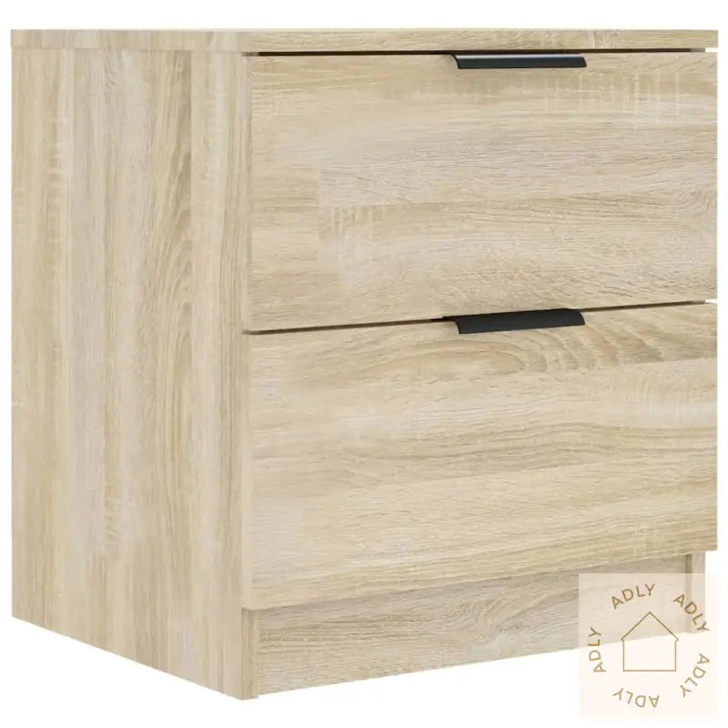 Premium materiale: Nattbordene er laget av konstruert tre – et slitesterkt og stabilt materiale som gir både styrke og lang levetid. Overflaten er glatt, noe som gjør at de tåler daglig bruk og motstår fuktighet godt. De er også enkle å holde rene – bruk bare en fuktig klut for å tørke over, så ser de nye ut.Rikelig lagringsplass: Hvert nattbord har to romslige skuffer, ideelt for å organisere bøker, magasiner, fjernkontroller eller andre småting du vil ha lett tilgjengelig ved sengen. Dette gir deg et ryddigere soverom og alt du trenger samlet på ett sted.Stabil topp: Den stabile bordplaten passer perfekt til å sette dekorative elementer på, som fotorammer, en liten bordlampe eller grønne planter. Toppen gir også ekstra plass om natten til mobiltelefonen eller et glass vann.Med disse nattbordene i sonoma eik får du møbler som harmonerer med forskjellige interiørstiler og passer like godt på soverommet som i andre rom der du ønsker smarte oppbevaringsløsninger. Garantert et flott valg hvis du ser etter kvalitetsmøbler til hjemmet.