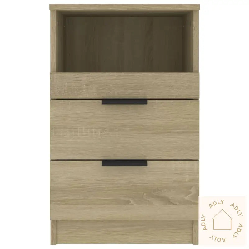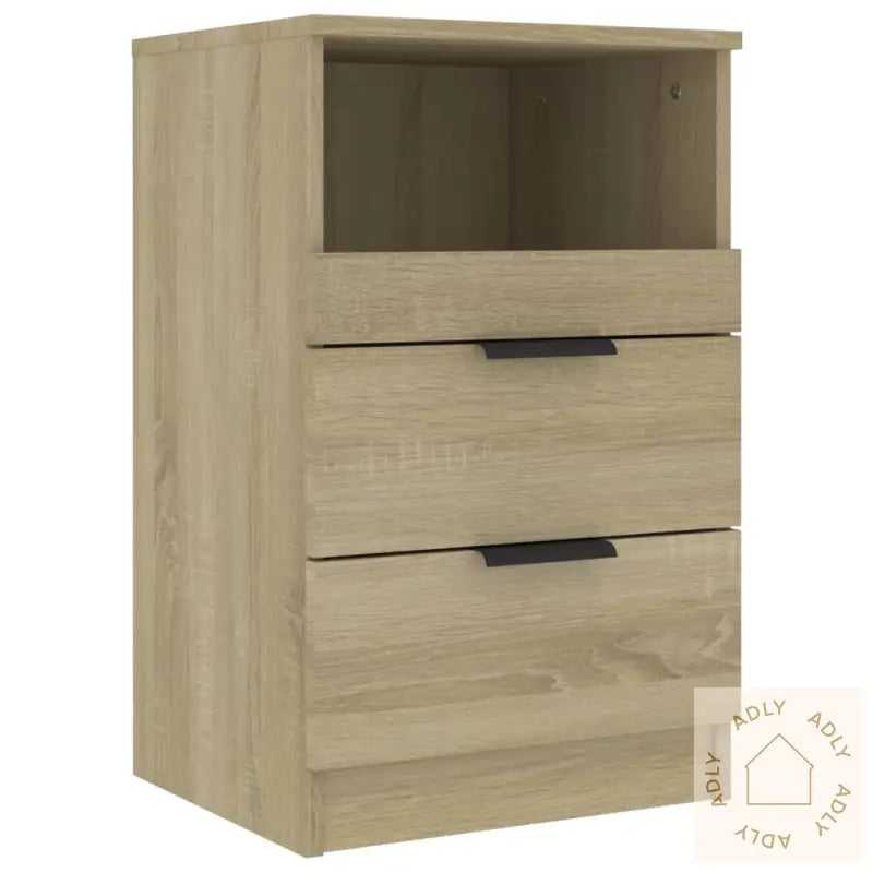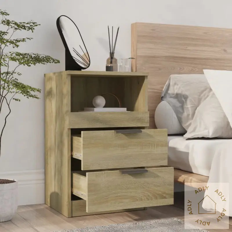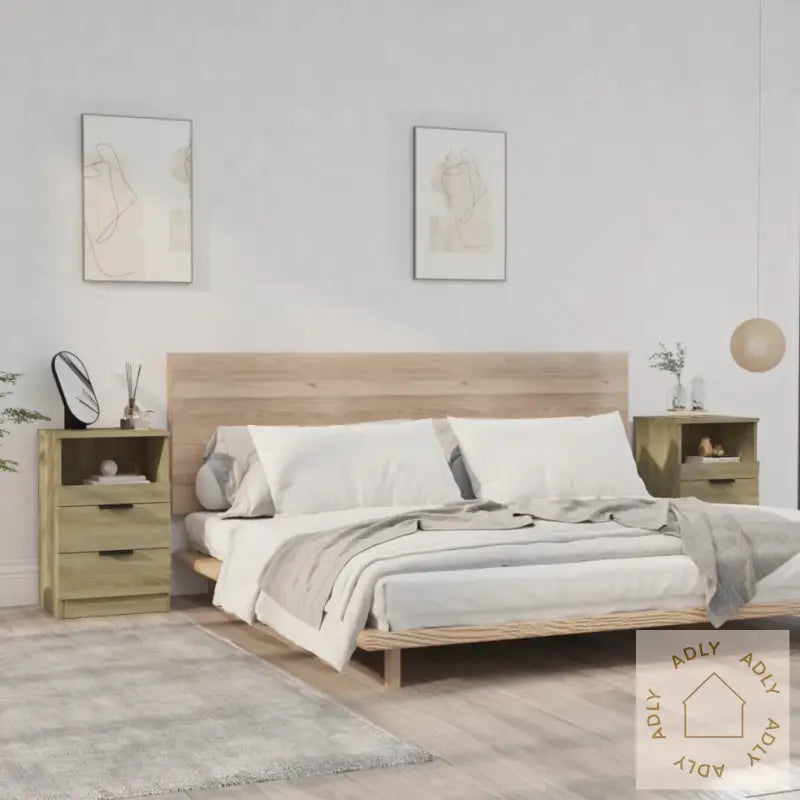 Premium materiale: Det konstruerte treverket i sonoma eik er kjent for sin sterke og stabile overflate, som også motstår fuktighet godt. Dette gjør at nattbordene er lette å rengjøre og holder seg fine lenge – bare en fuktig klut er nok til å ta bort støv eller smuss.Rikelig med lagringsplass: Med to skuffer og ett åpent rom gir hvert nattbord deg god plass til å organisere magasiner, bøker, fjernkontroller og alle småting du vil ha lett tilgjengelig, uten at det ser rotete ut.Stabil topp: Overflaten på nattbordene er solid og passer perfekt til dekorasjoner som fotorammer, vekkerklokke, potteplanter eller andre personlige detaljer du vil ha nært sengen.Advarsel: