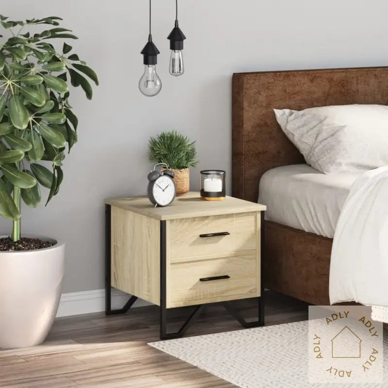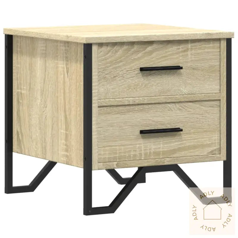 Holdbart materiale: Nattbordet er laget av konstruert tre med sonoma eik-finish, noe som gir en glatt overflate, god styrke og stabilitet. Materialet tåler daglig bruk og er motstandsdyktig mot fuktighet – perfekt for soverom eller stue med hagemøbler og andre bokhyller og stående hyller.Rikelig med oppbevaringsplass: To romslige skuffer gir deg masse plass til å organisere magasiner, bøker, fjernkontroller og småting du vil ha lett tilgjengelig, uten at det ser rotete ut.Solid topp: Den robuste toppen på nattbordet byr på perfekte muligheter for å vise frem favorittdekor, som bilder, lysestaker eller potteplanter som frisker opp rommet.Metallben: Sterke metallben gir nattbordet ekstra stabilitet og tilfører samtidig et moderne, avslappet preg til resten av interiøret, uansett hvilke møbler til hjemmet du velger.Farge: sonoma eikMaterialer: konstruert tre, metallMål: 40 x 41 x 40 cm (L x B x H)Montering kreves: ja
