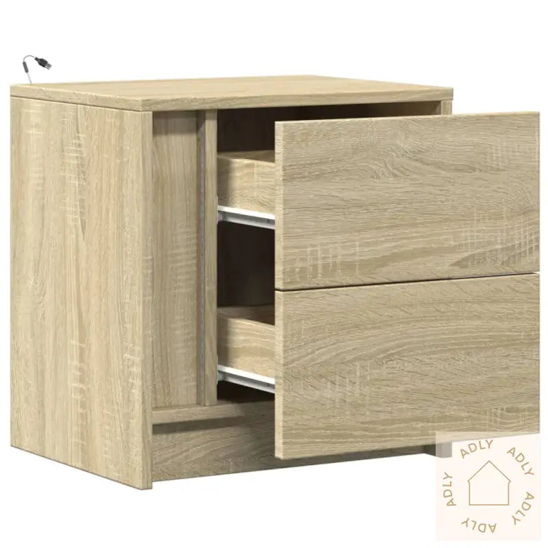 Produktet leveres med USB-kontakt og krever en sertifisert 5V USB-strømkilde (ikke inkludert).Farge: sonoma eikMateriale: konstruert treMål: 43 x 34 x 45 cm (B x D x H)Maksimal lastekapasitet (totalt): 50 kgMaksimal lastekapasitet (skuff): 5 kgMaksimal lastekapasitet (laminert plate): 40 kgMontering kreves: jaLeveransen inneholder:2 x nattbord