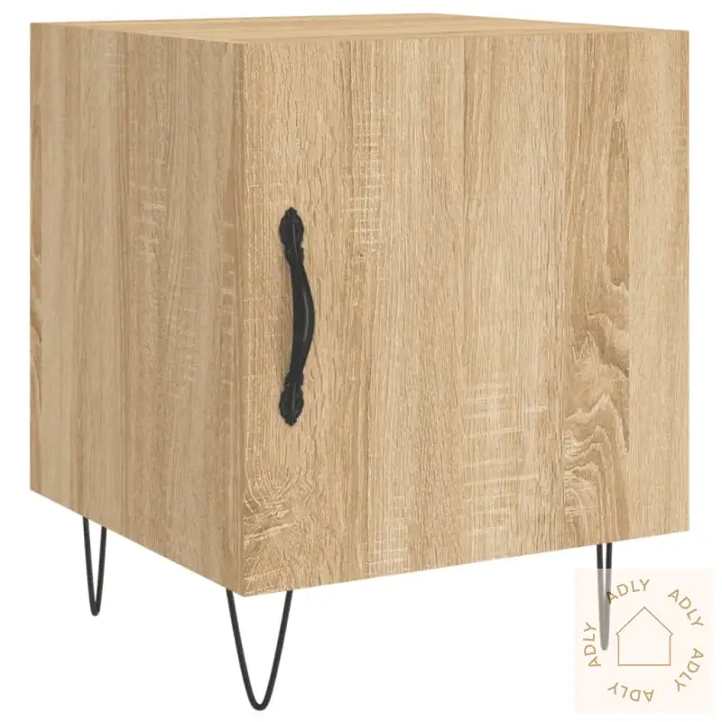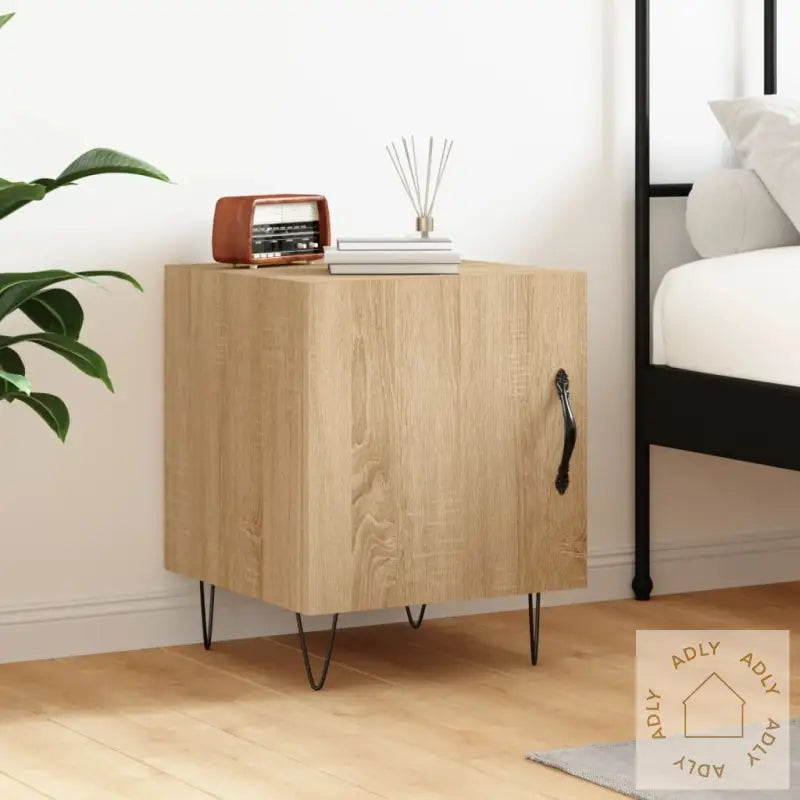 Slitesterkt materiale: Dette nattbordet er laget av konstruert tre av høy kvalitet, kjent for sin glatte overflate, styrke og stabilitet. Materialet motstår også fuktighet, noe som gjør det ideelt for daglig bruk.Romslig lagringsplass: Nyt god plass til å organisere bøkene dine, multimedia eller andre småting du vil ha lett tilgjengelig. Det åpne rommet sørger for at du alltid har det du trenger ved sengen.Visningsmuligheter: Toppen av nattbordet i sonoma eik gir deg en flott flate til å vise frem personlige bilder, dekorative elementer eller blomster, og løfter helheten i rommet.Metallføtter: Stødige metallføtter gir en røff touch til designet, samtidig som de bidrar til bedre stabilitet og lang holdbarhet på møbelet.Praktisk dør: Beskytt eiendelene dine mot støv ved å skjule dem bak døren, perfekt for ting du ønsker å holde ryddig men lett tilgjengelig.Advarsel: