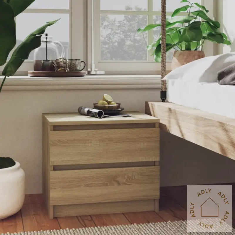 Den solide konstruksjonen i konstruert tre gir sideskapet en robust og langvarig kvalitet, slik at du kan stole på det i mange år fremover. I tillegg har nattbordet to romslige skuffer, så du enkelt kan organisere og oppbevare bøker, ladere, klær eller andre småting – alt innen rekkevidde ved sengen. Den vakre fargen i sonoma eik gir et moderne, naturlig preg som matcher andre hagemøbler, bokhyller og stående hyller i samme stil. Overflaten er glatt og enkel å rengjøre med en fuktig klut, noe som gjør vedlikeholdet problemfritt. Skapet leveres flatpakket og krever enkel montering.