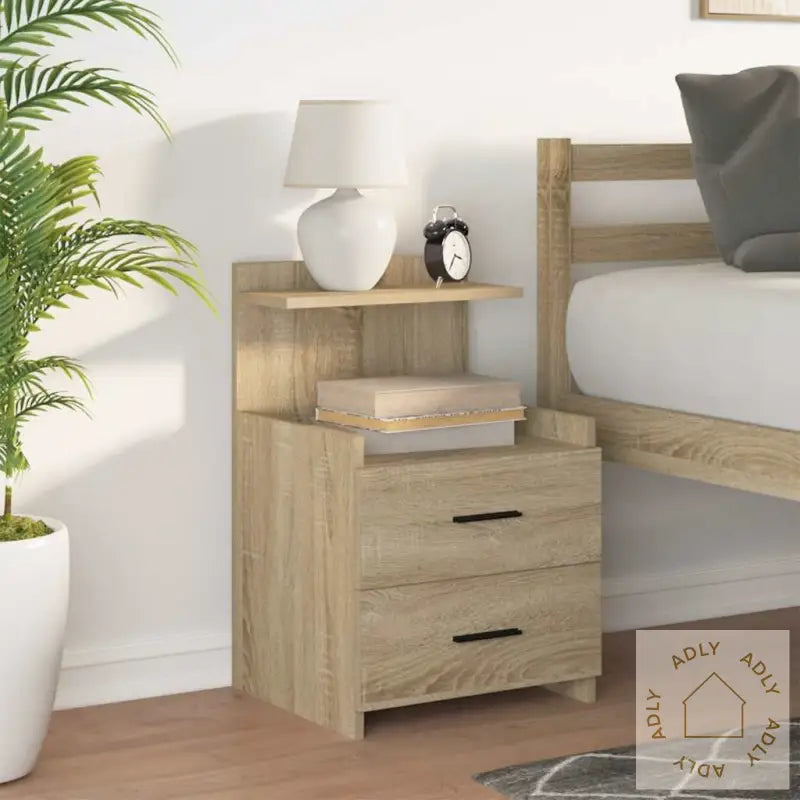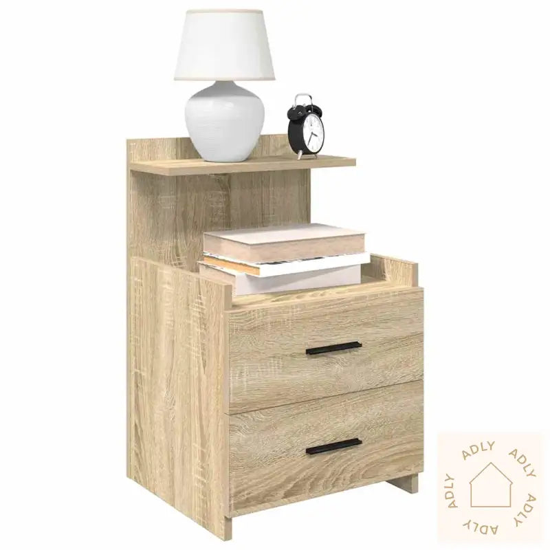 Stabilt og slitesterkt materiale: Nattbordet er laget av konstruert tre, som er kjent for å være både slitesterkt og stabilt. Overflaten er glatt og lettstelt, samtidig som den motstår både fuktighet, vridning og sprekker. Dette gir deg et robust møbel som står stødig over tid – en stor fordel når man velger møbler til hjemmet.Rikelig med oppbevaringsplass: Med to romslige skuffer og en praktisk, åpen hylle får du god plass til alt fra bøker og magasiner til personlige eiendeler. Dette gjør det lett å holde soverommet ryddig og oversiktlig, og sørger for at det viktigste alltid er innen rekkevidde.Praktisk bruk: Nattbordet har en høyde som passer perfekt ved siden av sengen, så du enkelt kan nå det du trenger. Skuffene åpnes jevnt med solide håndtak, noe som gir en behagelig opplevelse i hverdagen.Enkel å vedlikeholde: Den glatte overflaten gjør at du hurtigt fjerner støv eller flekker med en fuktig klut uten at det kreves tungvint vedlikehold. Et smart valg for deg som ønsker møbler som ser flotte ut med minimalt arbeid.Advarsel: