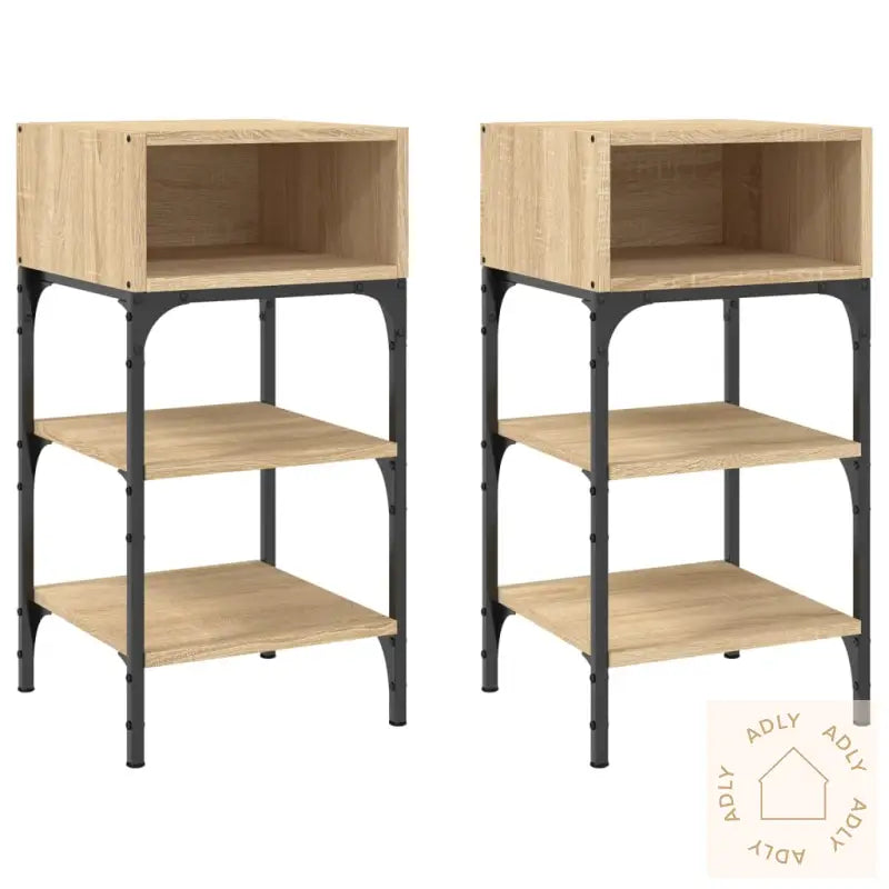 Slitesterkt materiale: Produsert i konstruert tre av høy kvalitet med en glatt overflate i fargen sonoma eik, er disse nattbordene både robuste og motstandsdyktige mot fuktighet, samtidig som overflaten er lett å holde ren. Dette sikrer lang varighet og gjør de til et bærekraftig valg blant møbler.God lagringsplass: Med praktisk oppbevaringsplass har du alltid plass til å organisere bøker, briller, ladere eller andre småting du trenger lett tilgjengelig ved sengen. Perfekt for å holde soverommet ryddig og oversiktlig.Justerbare føtter: Nattbordene har justerbare føtter slik at du enkelt kan få dem til å stå stabilt – også på gulv med litt ujevnheter. Dette gir ekstra trygghet og komfort.Robust ramme: Jernrammen gir ikke bare et moderne uttrykk, men sørger også for solid stabilitet og ekstra holdbarhet, så du får glede av nattbordene lenge.Visningsmuligheter: Topplaten gir god plass til dekorative elementer, som bilder, planter eller blomster – flotte for å sette et personlig preg på rommet og skape en hyggelig atmosfære sammen med dine andre møbler.Advarsel: