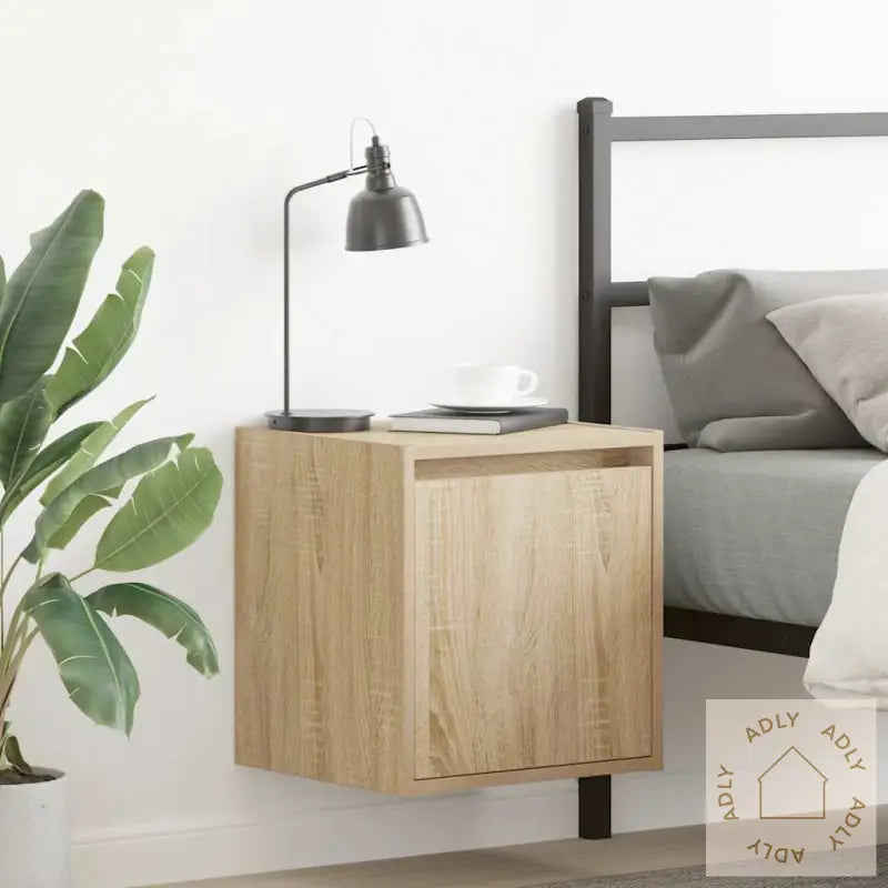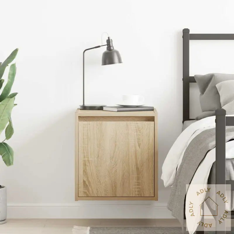 Oppgrader soverommet ditt med dette stilige veggmonterte nattbordsskapet i sonoma eik! Dette praktiske og moderne nattbordet passer sømløst inn sammen med ulike møbler til hjemmet, og gir soverommet ditt et ryddig og elegant preg.