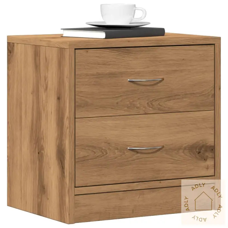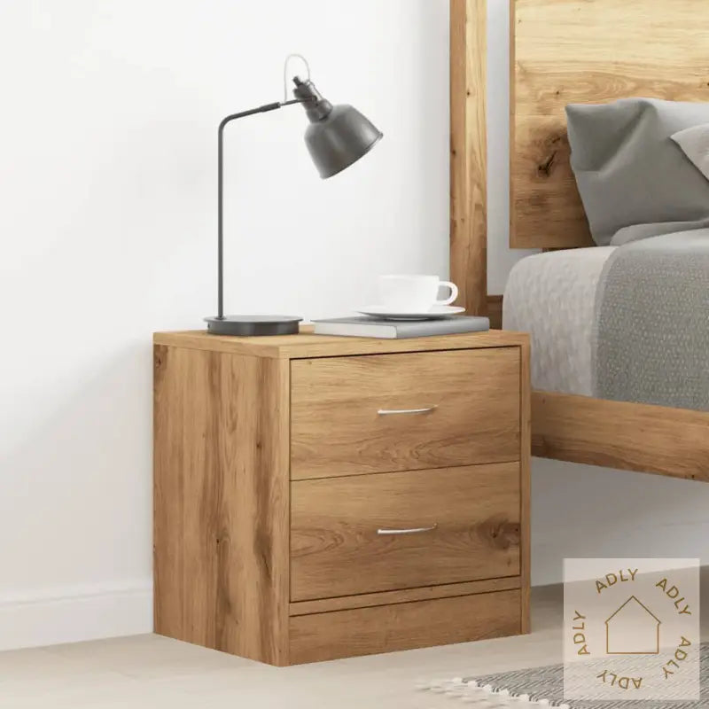 Holdbart materiale: Konstruert tre med førsteklasses kvalitet sikrer lang levetid og motstand mot fuktighet, perfekt for jevnlig bruk som en del av dine møbler til hjemmet. Den glatte overflaten gir enkel håndtering og et lekkert utseende som matcher moderne interiørstiler.Rikelig med oppbevaringsplass: Med 2 romslige skuffer får du god plass til å oppbevare alt fra bøker og elektronikk til andre småting du vil ha lett tilgjengelig ved sengen. Dette holder soverommet ryddig og gjør det enkelt å organisere eiendelene dine.Enkelt å vedlikeholde: Den glatte overflaten på artisan eik nattbordet gjør det superlett å tørke av med en fuktig klut, så det holder seg rent med minimal innsats.Farge: artisan eikMateriale: konstruert treMål: 40 x 30 x 40 cm (B x D x H)Med 2 skufferMontering kreves: ja