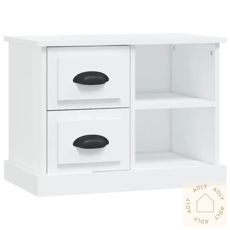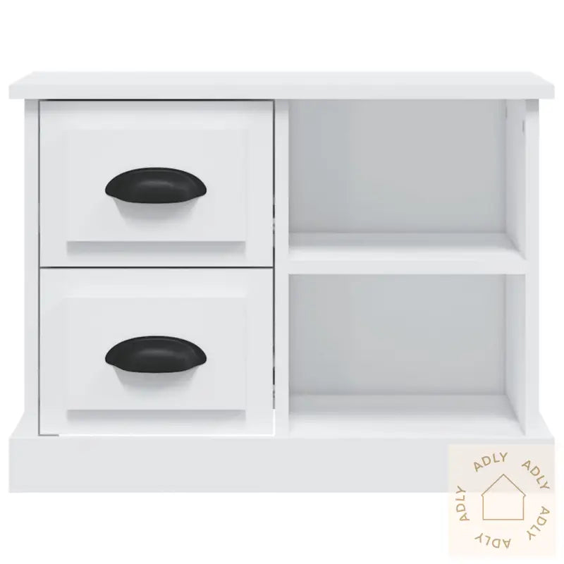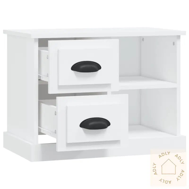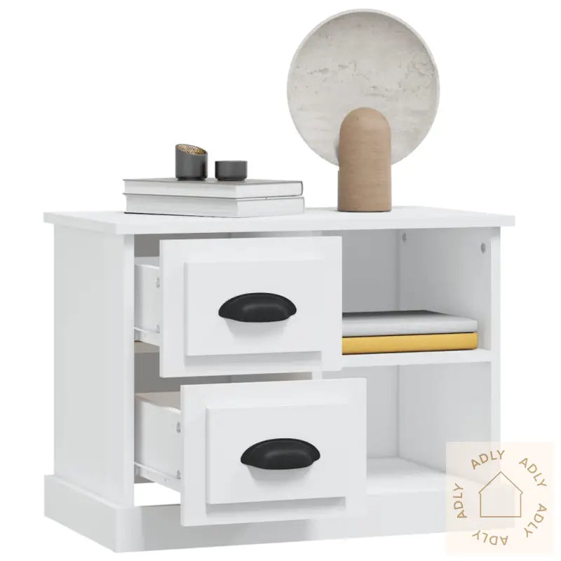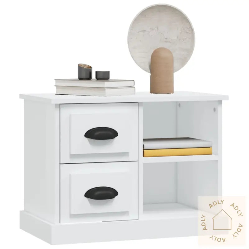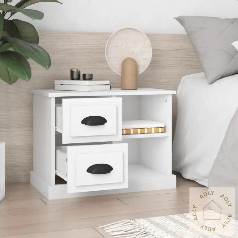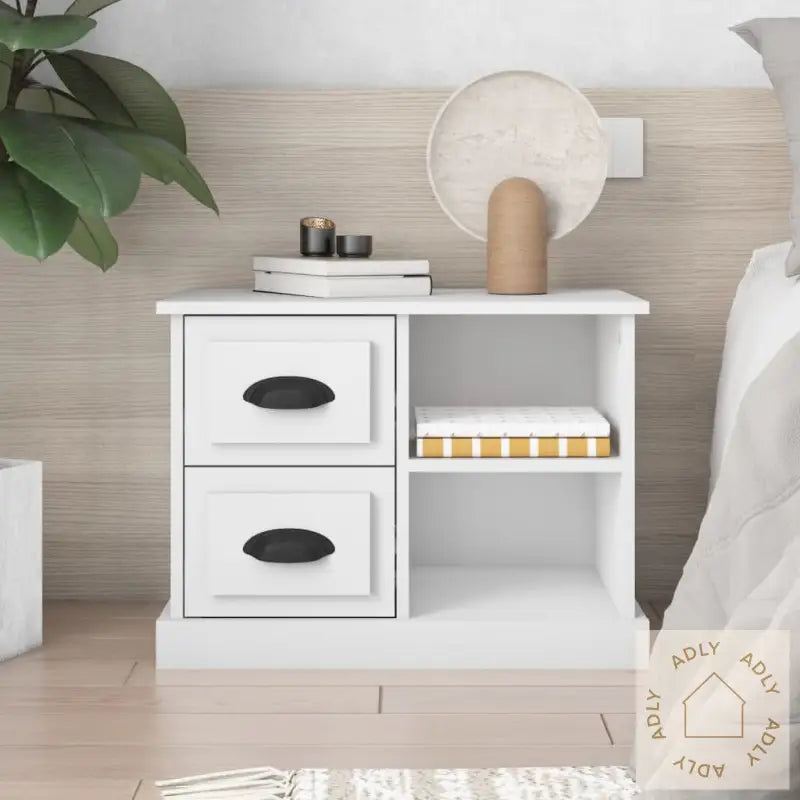 Slitesterkt materiale: Nattbordet er laget av konstruert tre av høy kvalitet som gir en glatt og elegant overflate. Dette materialet sørger for styrke, stabilitet og god motstand mot fukt, så du får et møbel som varer og ser bra ut lenge – selv i travle hjem.God lagringsplass: Med sine 2 romslige skuffer og 2 åpne rom får du masse plass til å holde småting, bøker eller laderne dine organisert og lett tilgjengelig. Perfekt når du vil ha det ryddig og alt innen rekkevidde ved sengen.Stabil og solid bordplate: Den robuste toppen gir deg mulighet til å vise frem personlige dekorgjenstander, familiebilder eller potteplanter uten bekymring. Her får du både funksjonalitet og sjanse til å gi nattbordet ditt et personlig preg.Godt å vite: