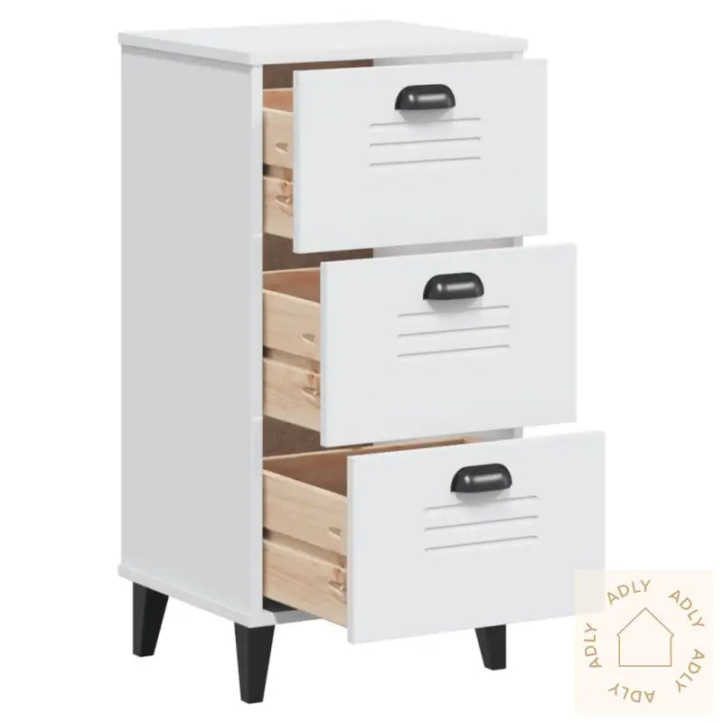 For å ivareta sikkerheten bør nattbordet alltid sikres med den medfølgende festeanordningen, slik at det ikke velter – spesielt i hjem med barn.Farge: hvitMaterialer: konstruert tre, plastMål: 40 x 35 x 80 cm (B x D x H)Ytre mål skuff: 35,5 x 22 cm (B x H)Med 3 skufferMed 3 plasthåndtakKolleksjon: VIKENMontering kreves: jaLegal Documents: