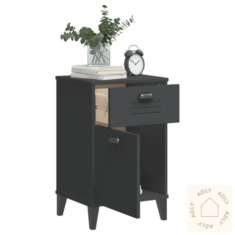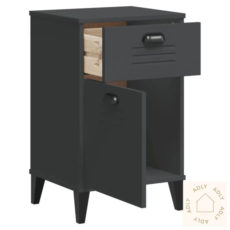 Slitesterkt materiale: Nattbordet er laget av konstruert treverk i høy kvalitet med en jevn og glatt overflate. Dette sikrer både styrke og stabilitet, og gjør nattbordet motstandsdyktig mot fuktighet – noe som gir lang levetid og lite vedlikehold.Rikelig med oppbevaringsplass: Med både en skuff og et rom med dør har du god plass til å oppbevare alt fra bøker til småting eller elektronikk, så soverommet eller stuen alltid ser ryddig ut.Enkel å holde rent: Nattbordet krever minimalt vedlikehold, og det er enkelt å holde overflatene pene og rene med en fuktig klut.Praktisk håndtak: To solide plasthåndtak gjør det enkelt å åpne og lukke både skuffen og døren, samtidig som de gir nattbordet et ekstra, dekorativt løft.Advarsel:
