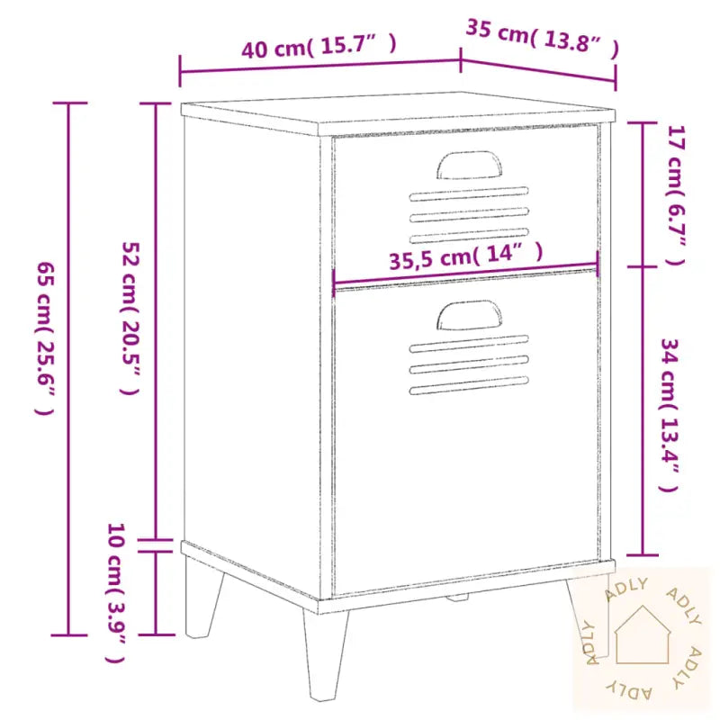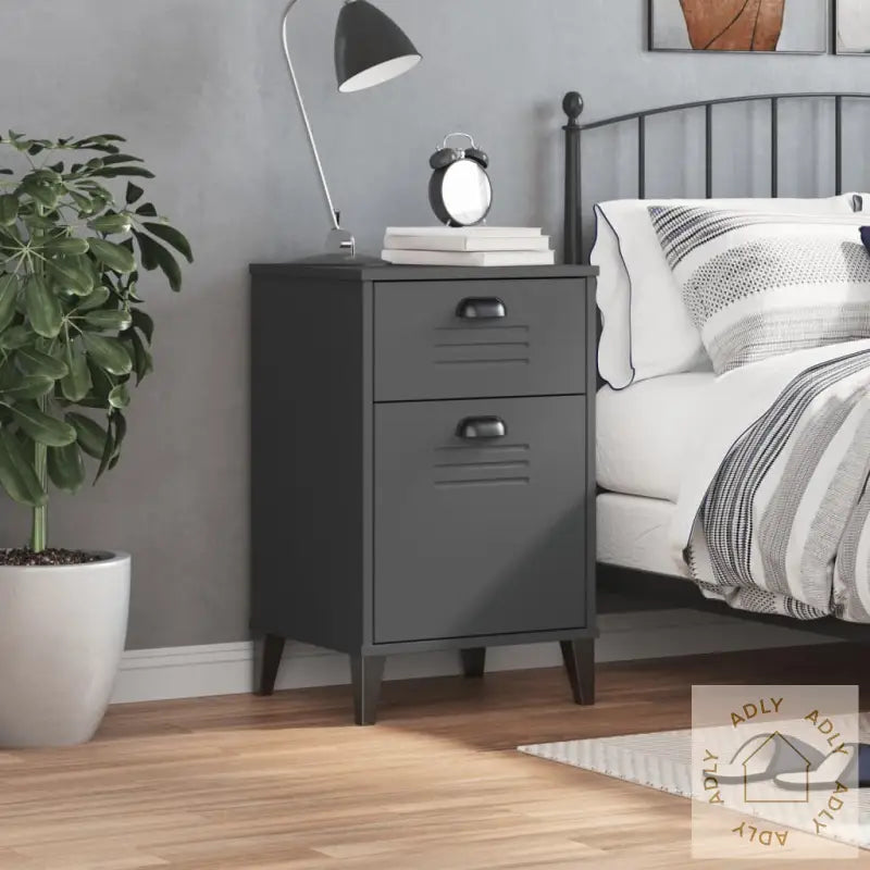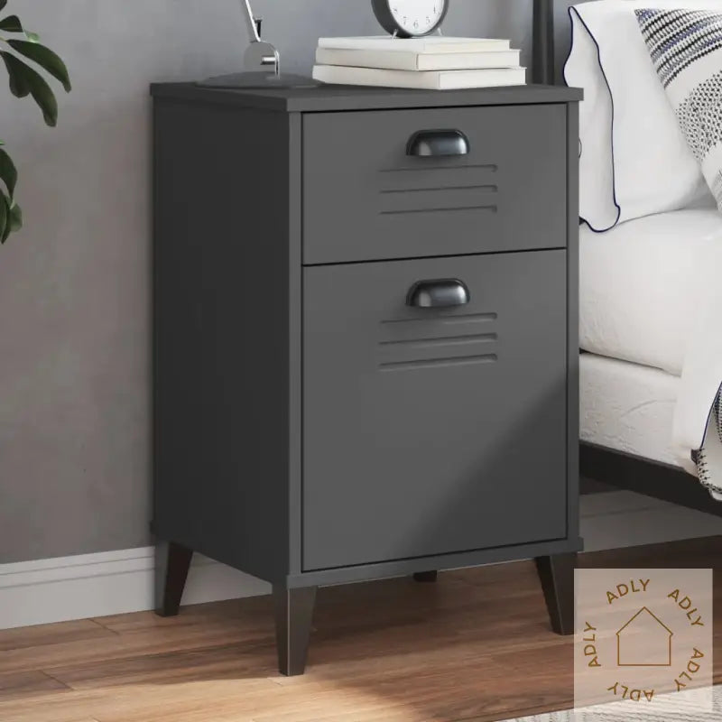Med sitt stilige og moderne design passer dette nattbordet perfekt inn i soverommet eller stuen, og gir interiøret et trendy industrielt preg. Det er et smart valg for deg som ønsker praktiske og funksjonelle møbler til hjemmet som samtidig ser bra ut.