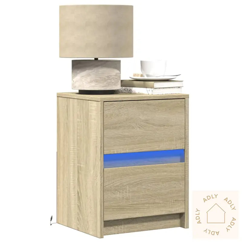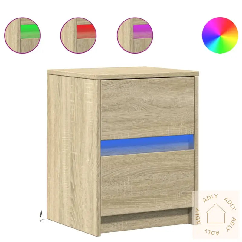 Holdbart materiale: Det konstruerte treverket av høy kvalitet sikrer lang levetid og solid bruk. Overflaten er både glatt og robust, så møblet tåler daglig bruk og viser styrke, stabilitet og god motstandskraft mot fuktighet – perfekt for deg som ønsker varige møbler til hjemmet.Rikelig med oppbevaringsplass: Tilgjengeligheten på romslig lagringsplass hjelper deg holde orden på alt fra bøker og ladere, til småting og personlige eiendeler. Alt du trenger, blir lett tilgjengelig rett fra senga eller sofaen.RGB LED-lys for en hyggelig atmosfære: Nattbordet kommer med integrert RGB LED-belysning, som lar deg justere lysstyrke, farge og moduser etter humør eller anledning. Dette gir et moderne preg og gjør det enkelt å sette en koselig stemning i rommet.Enkelt å vedlikeholde: Med den glatte overflaten er det raskt å tørke bort støv og smuss med en fuktig klut. Dette betyr lite vedlikehold og mer tid til å nyte hagemøbler og resten av innredningen din.Advarsel: