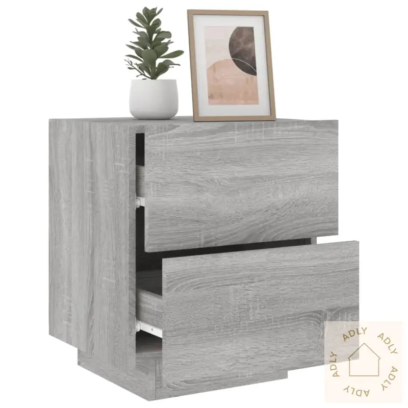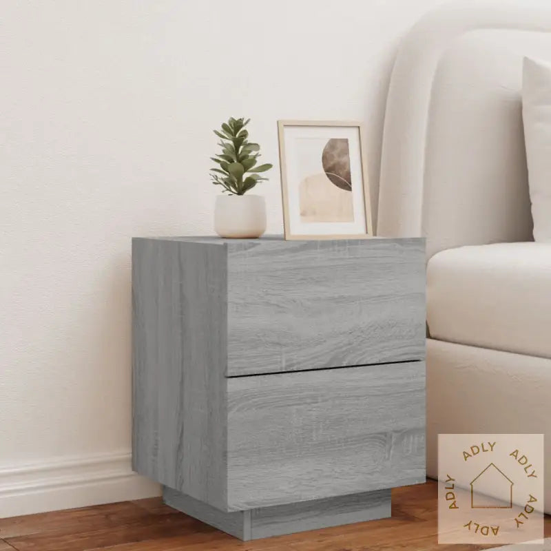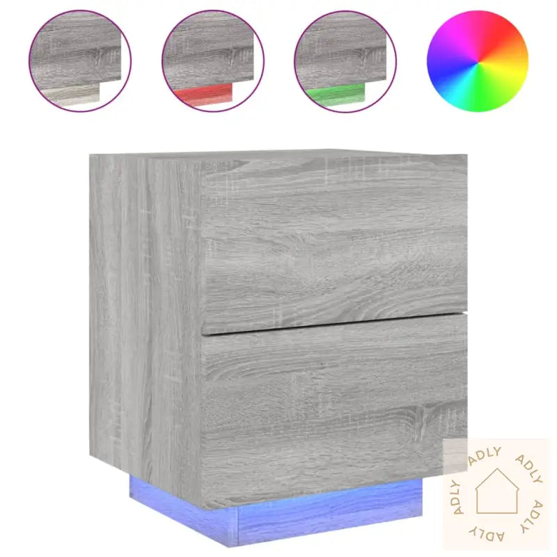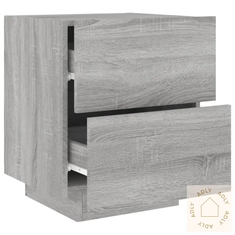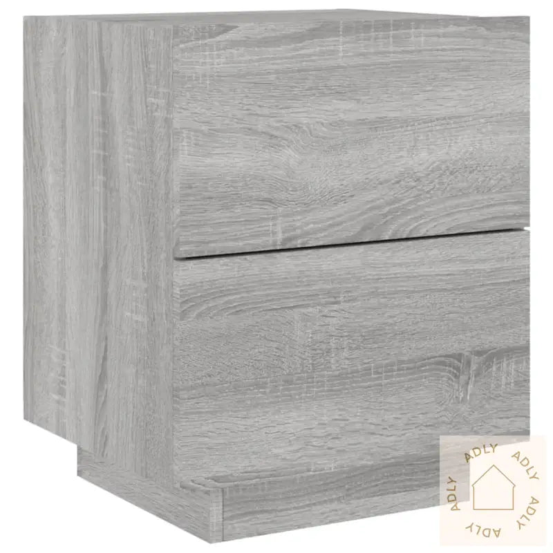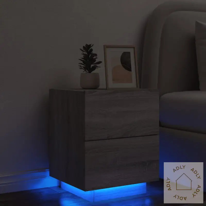 Slitesterkt materiale: Det konstruerte treet gir nattbordet en jevn og moderne finish samt lang levetid. Treet er nøye utvalgt for å tåle daglig bruk og motstå fukt, slik at du får et bord som holder seg fint lenge.RGB LED-lys: Skap stemning i rommet ditt med innebygde, fargerike RGB LED-lys. Du kan enkelt bytte mellom forskjellige lysfarger med flere menyvalg, eller la dem automatisk endre farge etter humør. LED-lysene løfter det moderne designet til nye høyder og gir nattbordet et unikt og trendy preg, samtidig som de gir et behagelig lys på kveldstid.Rikelig med lagringsplass: Med to dype skuffer får du praktisk lagringsplass til småting, magasiner, fjernkontroller eller bøker. Hold alt du trenger ved sengen ryddig og lett tilgjengelig! Skuffenes mål gir deg godt overblikk over innholdet uten at noe blir borte nederst.Stabil bordplate: Øverst på nattbordet finner du god plass til dine favorittdekorasjoner, familie- eller vennebilder, vekkerklokken eller en grønn potteplante. Det gjør det lett å personliggjøre rommet og skape et koselig inntrykk.Godt å vite:
