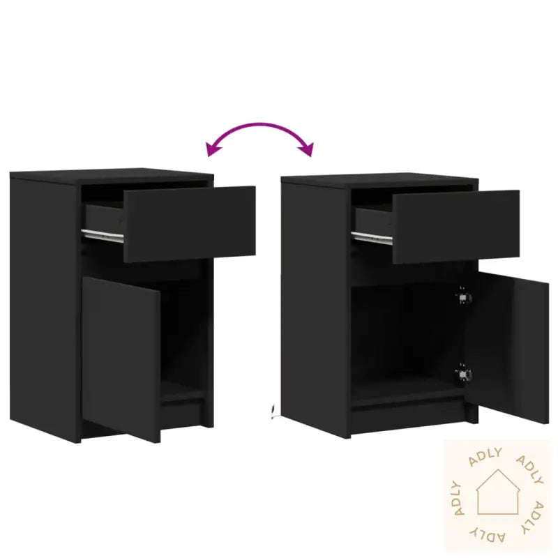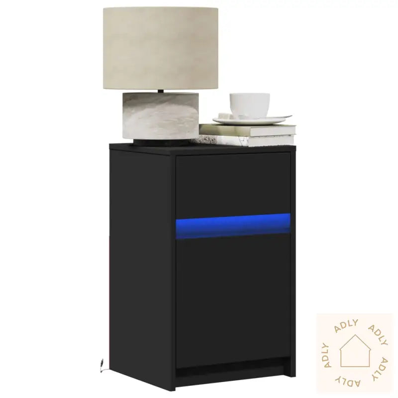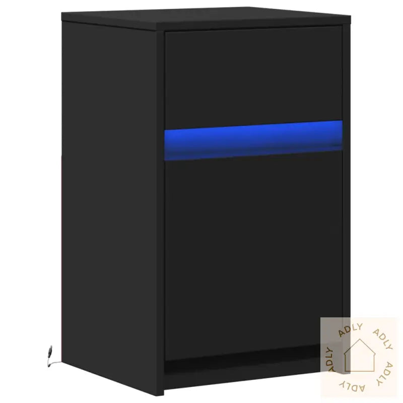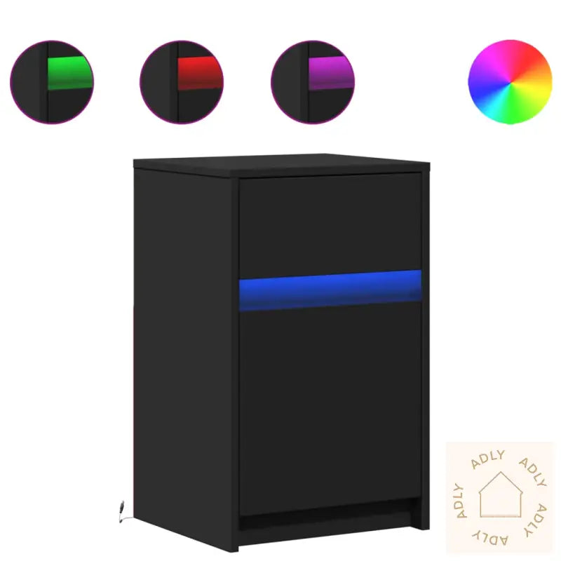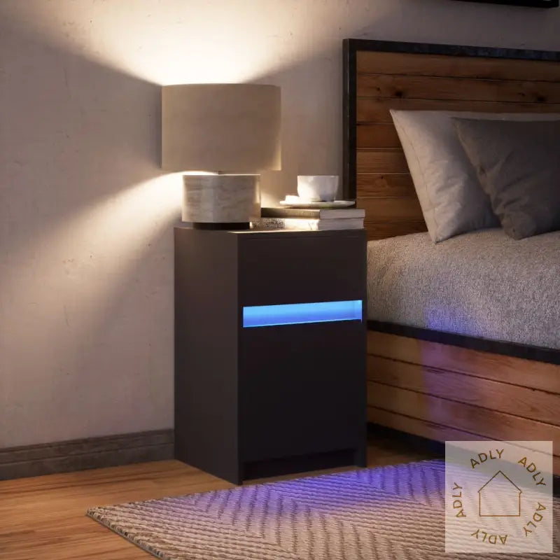 Holdbart materiale: Nattbordet er laget av konstruert treverk, kjent for sin styrke, stabilitet og lang levetid. Overflaten er glatt og motstandsdyktig mot fukt, noe som gjør det praktisk for daglig bruk og et smart valg for møbler til hjemmet.Rikelig med oppbevaringsplass: Du får god plass til å organisere og oppbevare personlige eiendeler, bøker eller elektronikk. Alt du trenger holdes lett tilgjengelig, samtidig som overflaten holder seg ryddig.RGB LED-lys for en hyggelig atmosfære: Med innebygde LED-lys kan du enkelt tilpasse stemningen i rommet. Velg mellom ulike moduser, farger og lysstyrker for å skape et personlig lysshow – perfekt for både avslapning og når du vil sette et eget preg på soverommet eller stuen.Enkelt å vedlikeholde: Den glatte overflaten gjør rengjøringen enkel. En rask avtørking med en fuktig klut er ofte alt som trengs, så dette nattbordet krever veldig lite vedlikehold.Advarsel: