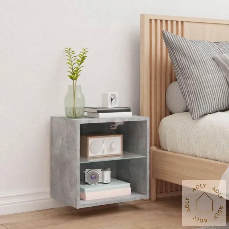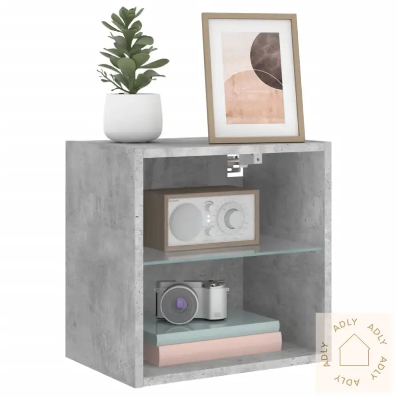 Skruer og plugger til veggmontering følger ikke med. Finn skruer og plugger som passer for akkurat din veggtype. Er du usikker, rådfør deg gjerne med fagfolk. Husk å følge alle instruksjonene grundig for sikker montering.Produktet leveres med USB-kontakt og må kobles til en sertifisert 5V USB-strømkilde (følger ikke med).Farge: betonggråMaterialer: konstruert tre, glassMål: 40 x 28,5 x 40 cm (L x B x H)Montering kreves
