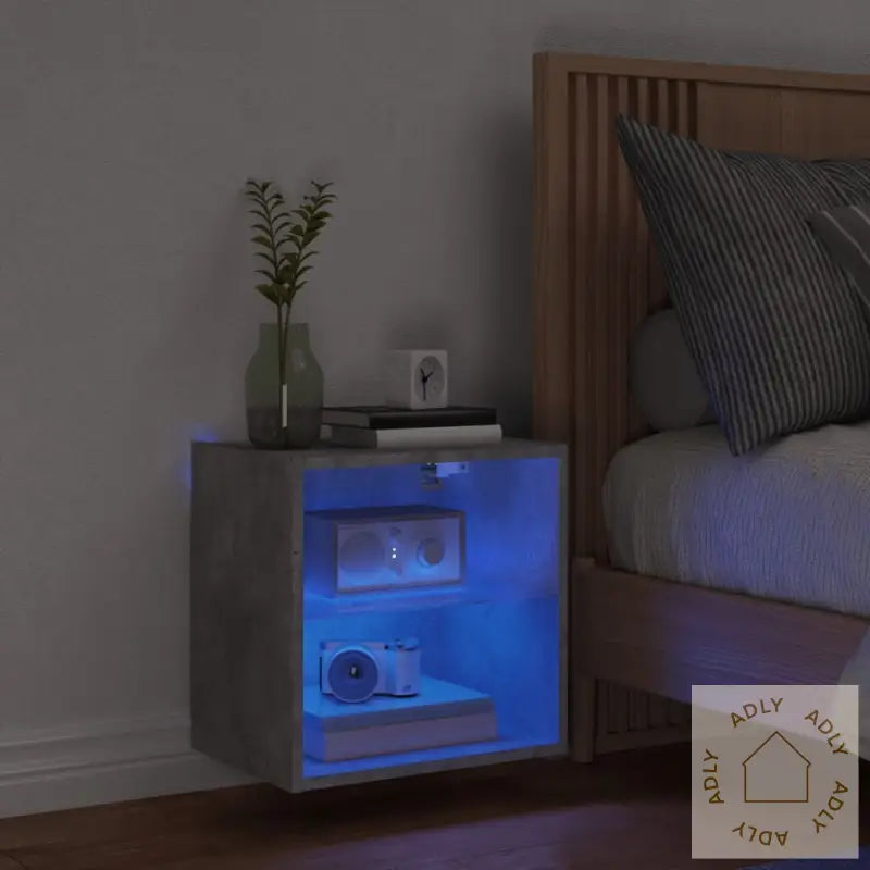 Slitesterkt materiale: Dette nattbordet er laget av konstruert treverk med høy kvalitet og en jevn, glatt overflate. Materialet har både god styrke og stabilitet, samtidig som det tåler fuktighet godt, noe som gjør det ekstra robust for daglig bruk.Rikelig med lagringsplass: Du får god plass til å holde ting organisert – enten det er bøker, magasiner, fjernkontroller eller andre småting du vil ha lett tilgjengelig ved sengen.RGB LED-lys: Den innebygde belysningen gir deg muligheten til å velge mellom ulike farger takket være fargerike RGB LED-lys. Du kan enkelt justere stemningen på rommet, og lysene kan settes til å endre farge automatisk for en mer levende atmosfære.Visningsfunksjon: Toppen av nattbordet er solid og gir deg muligheten til å sette fram dekor, bilder eller potteplanter – en fin måte å personliggjøre rommet ditt sammen med andre møbler til hjemmet.Veggmontert design: Dette nattbordet kan monteres på veggen, noe som frigjør gulvplass og gir soverommet et ryddigere og mer moderne uttrykk. Perfekt om du ønsker mer plass og enkel tilgang til det du trenger.Godt å vite: