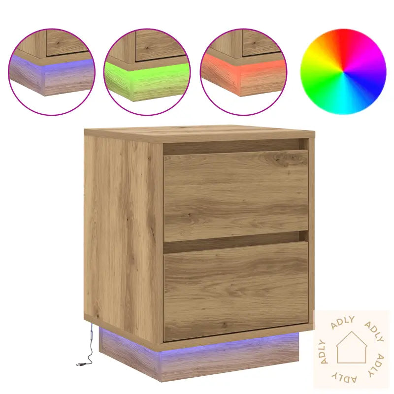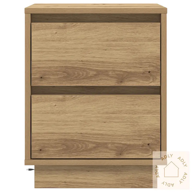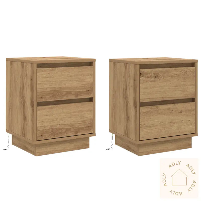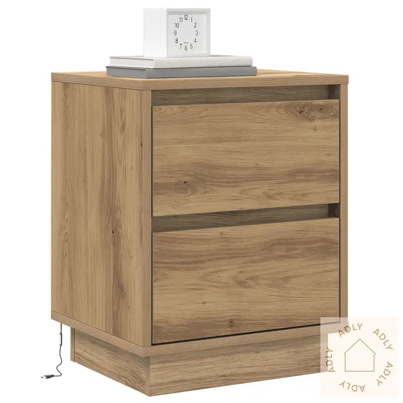 LED Lyslist: Hvert nattbord har en integrert LED lyslist som gir et moderne preg og gjør at du enkelt får myk belysning på soverommet, enten du leser litt før du sovner eller vil finne ting uten å forstyrre resten av huset. Det skapes i tillegg en lun og koselig atmosfære, som hjelper deg å slappe av etter lange dager.Myk-lukk Skuffer: Skuffene har myk-lukk mekanisme som sikrer at de glir igjen stille og dempet – perfekt når man ikke vil lage lyd sent på kvelden. Dette bidrar til en behagelig og rolig opplevelse, og sørger for enkel tilgang til nattilbehøret ditt uten bråk.Moderne Design: Matt overflate og minimalistiske linjer gir nattbordene en tidløs moderne stil. Den håndlagede eikefinishen gir en eksklusiv følelse, samtidig som den er lett å matche med ulike interiørvalg, enten du liker det stramt og moderne eller mer lunt og klassisk. Du får et møbel som umiddelbart gir soverommet et løft.Optimal Oppbevaringsplass: Romslige skuffer (40 cm x 30 cm x 15 cm) gjør det enkelt å holde bøker, ladeledninger, briller eller andre småting ryddig organisert og ute av syne. Med smarte lagringsmuligheter får du mest mulig ut av plassen, og slipper rot rundt sengen.Enkel Montering: Nattbordene er designet slik at du raskt setter dem sammen selv – alt du trenger er en skrutrekker og ca. 45 minutter. Monteringen krever kun én person, så du får oppgradert soverommet ditt på kort tid og uten stress.Antall: 2Farge: BrunForm: RektangulærMateriale: Naturlig TreFinish: MattInnendørs/Ute: Kun innendørsDeksel inkludert: NeiRom: SoveromStrømkilde: StikkontaktBatterier inkludert: NeiOverflatehøyde: 2 cmMerke:Levering inkluderer: 2 nattbordMontering kreves: JaAnbefalt antall personer for montering: 1
