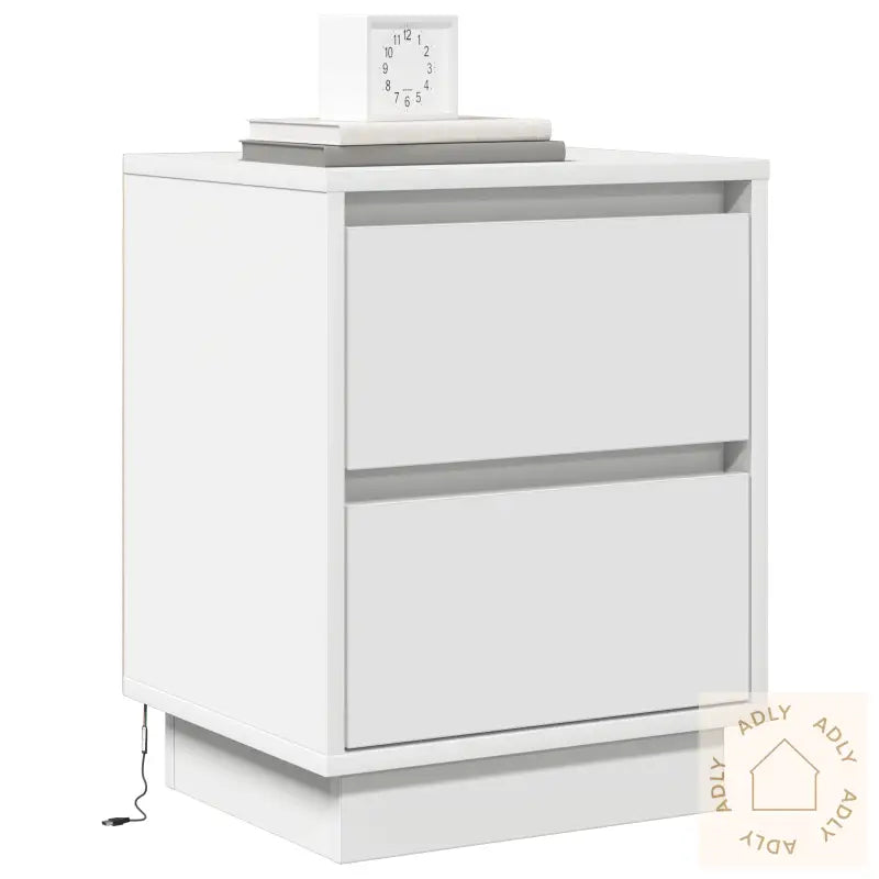 LED Lyslist: Få litt ekstra kos med integrerte LED-lys som lyser opp omgivelsene, og gir soverommet en moderne og lun atmosfære. Denne LED-løsningen gjør det ekstra hyggelig under kveldsrutiner og tilfører rommet et unikt designpreg – alt inkludert i møbelet.Skuffer med myk lukking: Skuffene har moderne myk lukking, noe som betyr at de glir rolig og lydløst igjen. Du slipper både smell og unødvendig bråk om natta, så du kan hente eller sette bort ting uten å forstyrre nattesøvnen til andre. Dette er en praktisk løsning som gir økt komfort og ro i soverommet, spesielt for deg som liker moderne møbler med smarte detaljer.Moderne design: Nattbordene har matte, glatte overflater og rette linjer, noe som reflekterer tidens interiørtrender. De passer inn med det meste av møbler til hjemmet, enten du har minimalistiske bokhyller og stående hyller eller går for et mer urbant uttrykk.Optimal lagringsplass: Fire romslige skuffer i hvert nattbord gir masse lagringsplass til bøker, småting eller ting du vil ha nær senga. Hver skuff har god størrelse (30 cm lang, 25 cm bred, 10 cm høy), så du får faktisk plass til det meste du vanligvis trenger å ha lett tilgjengelig på soverommet.Enkel montering: Her slipper du stress – to personer klarer monteringen lett ved hjelp av tydelige trinn-for-trinn-instruksjoner. Du trenger kun en skrutrekker for å få alt på plass.Antall varer: 2Farge: Hvit Form: RektangulærMaterial: Konstruert treFinish: MattInnendørs/Ute: Kun innendørsDeksel inkludert: NeiRom: SoveromStrømkilde: StikkontaktBatterier inkludert: NeiMaks antall personer: 1Overflathøyde: 1.5 cmBein høyde: 5 cmMerke: Levering inneholder: 2 NattbordMontering nødvendig: JaAnbefalt antall personer for montering: 2