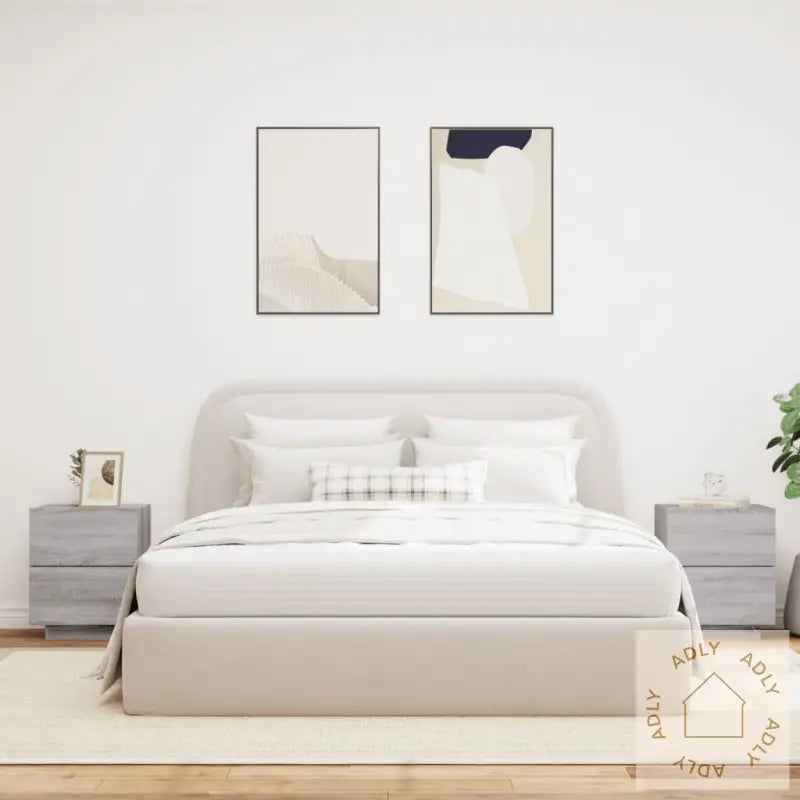 Slitesterkt materiale: Nattbordene er produsert i konstruert tre av høy kvalitet. Overflaten er glatt, samtidig som materialet gir både god styrke, stabilitet og motstand mot fuktighet – noe som gjør disse møblene til et robust valg for daglig bruk.RGB LED-lys: Skapene er utstyrt med stemningsskapende RGB LED-lys som virkelig fremhever deres moderne uttrykk. Ved hjelp av ulike tilpasningsmenyer kan du enkelt endre fargene, la lysene skifte automatisk, eller matche lyset til stemningen i rommet. Dette gir ekstra fleksibilitet og et trendy preg til interiøret, perfekt enten du slapper av alene eller har besøk.Rikelig med lagringsplass: Hvert nattbord leveres med to romslige skuffer. Disse gir deg rikelig plass til å organisere magasiner, bøker, fjernkontroller eller andre småting du vil ha lett tilgjengelig ved sengen. Se egne mål skuff for detaljerte størrelser på både indre og ytre mål.Stabil bordplate: Toppen av hvert nattbord er ideell til å vise frem favorittingene dine, som pyntegjenstander, bilder eller potteplanter. Det gir deg et personlig og koselig preg på soverommet.Godt å vite: