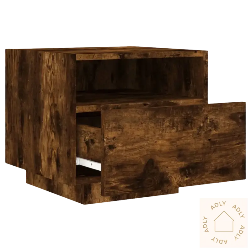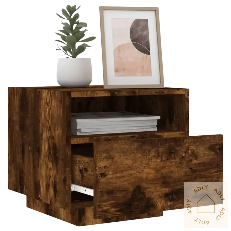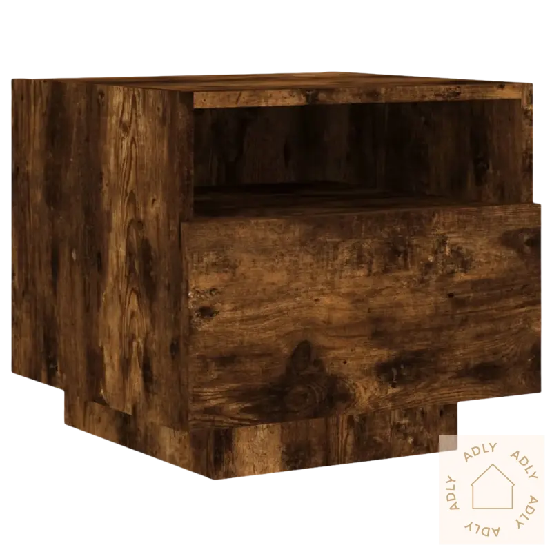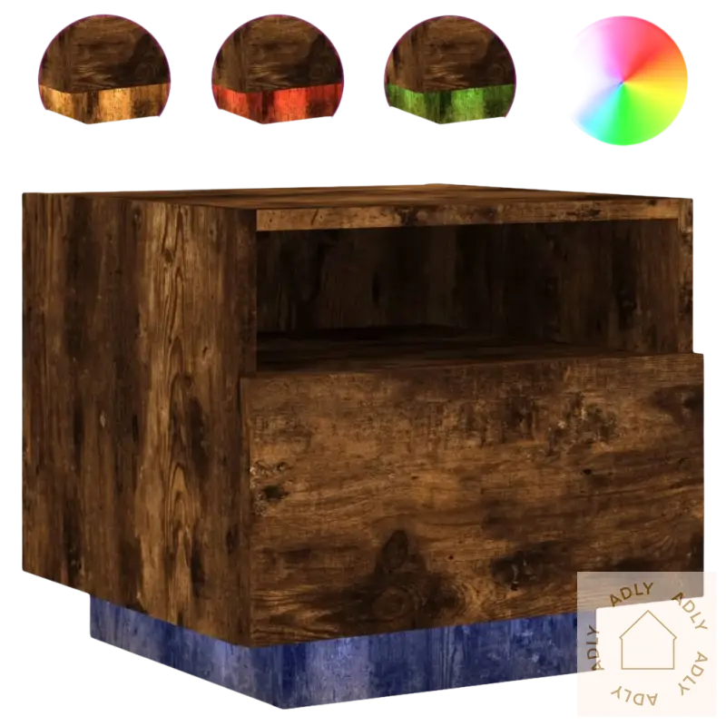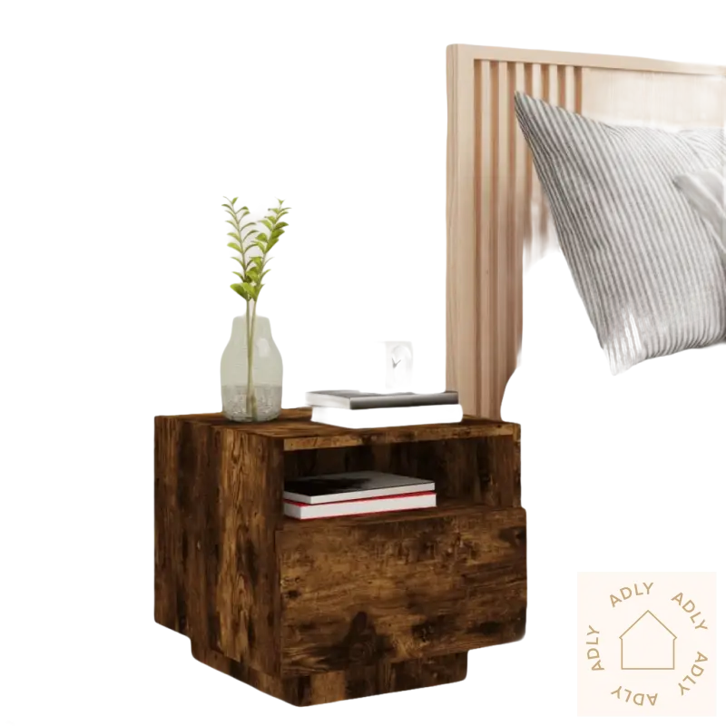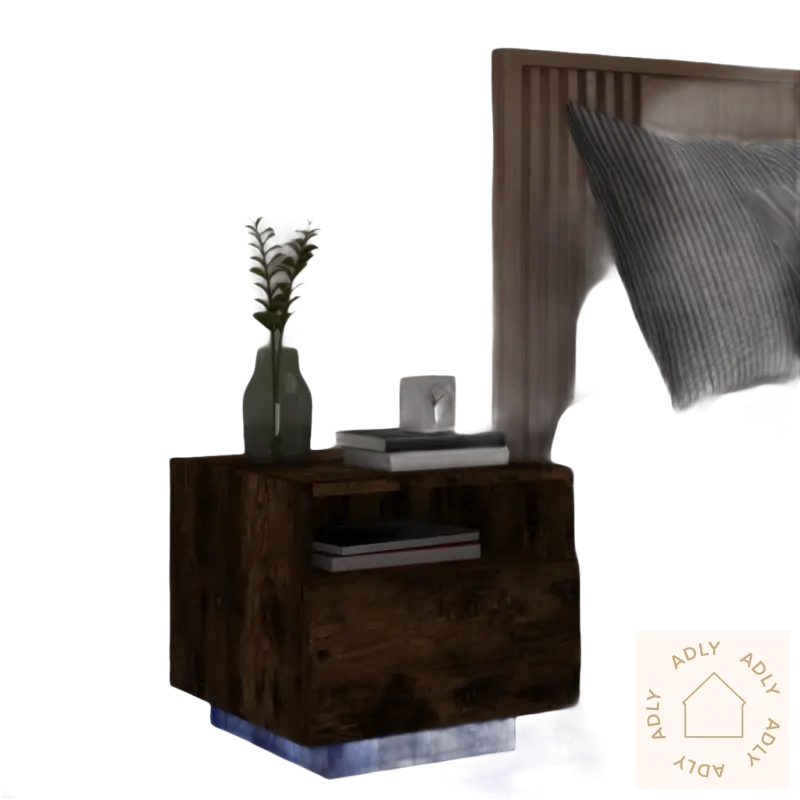 Slitesterkt materiale: Laget av høykvalitets konstruert tre, er dette nattbordet både solid og stabilt, og det tåler fuktige omgivelser godt – noe som sikrer lang levetid og lite vedlikehold. Den glatte overflaten gjør det enkelt å tørke bort støv eller flekker, så møbelet holder seg pent over tid.RGB LED-lys: Med integrerte RGB LED-lys kan du skape akkurat den stemningen du ønsker på soverommet. Velg mellom flere farger og effekter via ulike menyer, slik at belysningen automatisk tilpasses stemningen du er ute etter – perfekt for kveldskos eller et avslappet miljø.Rikelig med lagringsplass: Praktiske skuffer og hylleløsninger gir god plass til magasiner, bøker, fjernkontroller og småting du vil ha lett tilgjengelig, slik at alt du trenger for kvelden er samlet på ett sted og rommet ser ryddig ut.Visningsfunksjon: Den robuste toppen gir god plass til pynt, bilder eller planter og lar deg personliggjøre rommet akkurat slik du vil. Pynt gjerne med dekorative detaljer for et lunt utrykk.Godt å vite: