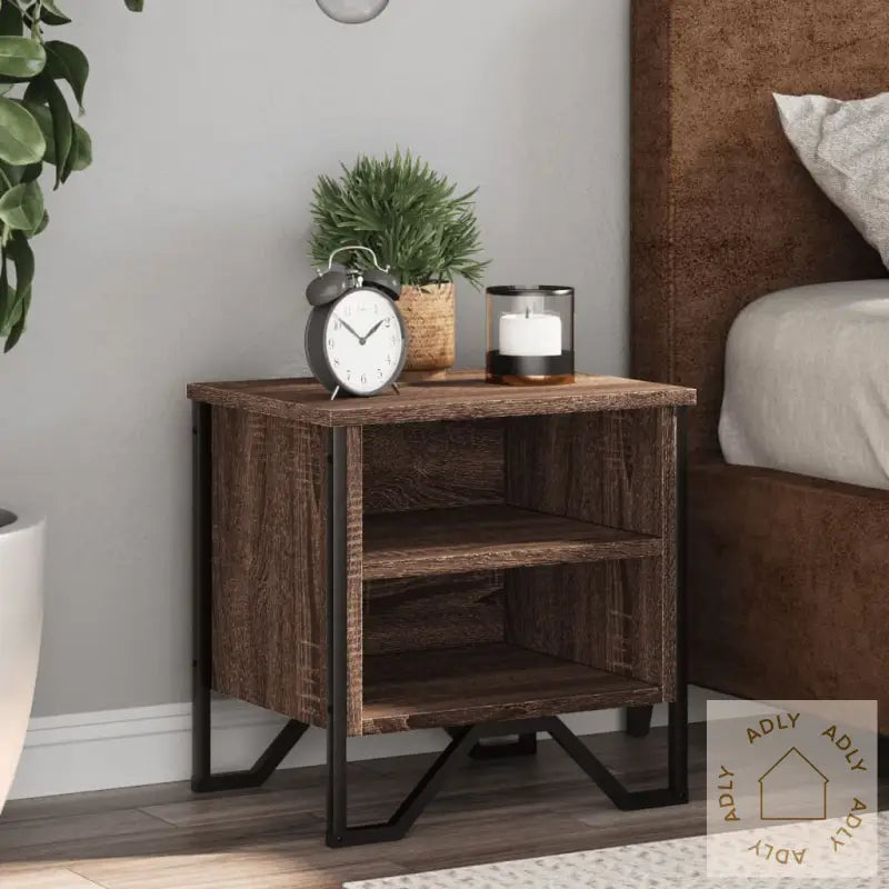 Holdbart materiale: Laget av konstruert treverk av høy kvalitet med glatt overflate, gir bordet ekstra styrke, stabilitet og god motstand mot fukt, så det kan vare lenge. Dette gjør det ideelt både som nattbord og for deg som leter etter solide hagemøbler til bruk innendørs.Med oppbevaringsplass: Den åpne hylla under bordplaten gir deg praktisk lagringsplass til småting som bøker, fjernkontroller, ladere og annet du vil ha lett tilgjengelig. Her kan du enkelt organisere det du trenger ved sengen eller sofaen.Solid bordplate: Den solide bordplaten tåler opptil 70 kg og passer perfekt til å holde alt fra mat og drikke til pynt, bilder eller potteplanter. Med solid bordplate får du plass til akkurat det du vil vise fram eller ha for hånden.Enkelt å vedlikeholde: Takket være den jevne, glatte overflaten av konstruert tre er bordet superlett å holde rent – bare tørk av med en fuktig klut for å fjerne støv eller flekker. Det krever minimalt med vedlikehold, så du får mer tid til å slappe av.Farge: brun eik – gir et varmt, naturlig preg og matcher de fleste interiørstiler.Materialer: konstruert tre og metall gir kombinasjonen av styrke og stilig utseende.Mål: 40 x 30 x 40 cm (B x D x H) – kompakt størrelse, perfekt som nattbord eller sidebord.Maksimal lastekapasitet (totalt): 70 kg.Montering kreves: ja, enkel montering følger med.