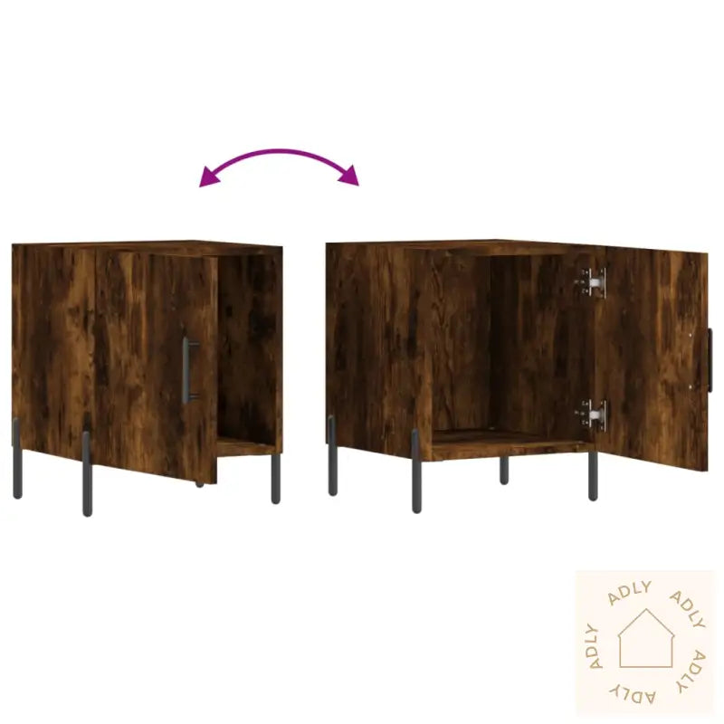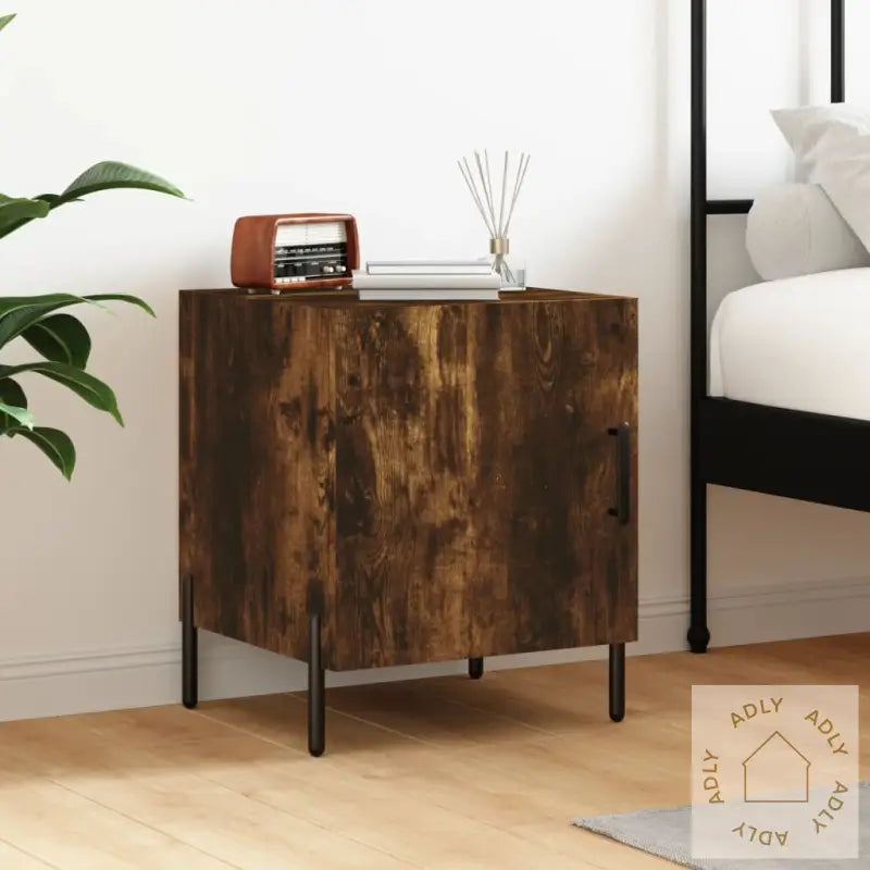 Slitesterkt materiale: Det konstruerte treverket er laget for å tåle daglig bruk. Overflaten er glatt, lett å holde ren og imponerer med sin styrke og stabile konstruksjon. Materialet har god motstand mot fuktighet, så du får et møbel som holder seg pent lenge.Romslig lagringsplass: Her får du et funksjonelt nattbord med romslig lagringsplass. Det åpne rommet gir deg plass til bøker, multimedia-utstyr og andre småting som du vil ha tilgjengelig på soverommet – perfekt hvis du liker orden og vil ha alt innen rekkevidde.Visningsfunksjon: Toppen av nattbordet inviterer til personlig preg – pynt med dine favorittbilder, dekorative gjenstander eller friske blomster. Dette gir et ekstra løft til det visuelle uttrykket i rommet ditt.Metallføtter: Nattbordet står stødig på robuste metallføtter, som gir en kul, rolig stil og sørger for god stabilitet.Praktisk dør: Oppbevar private eiendeler eller nødvendigheter skjult og beskyttet bak den praktiske døren slik at de holder seg fri for støv, samtidig som du får et ryddig soverom.Advarsel: