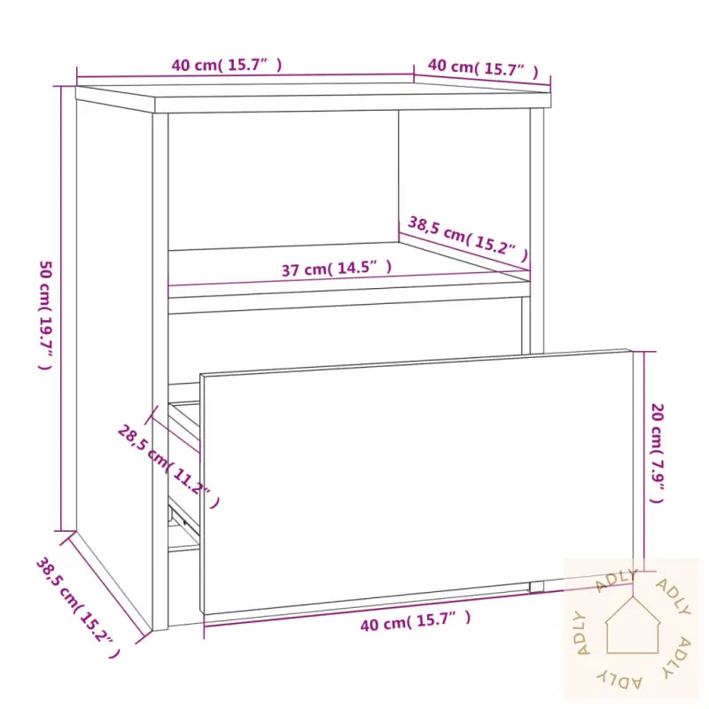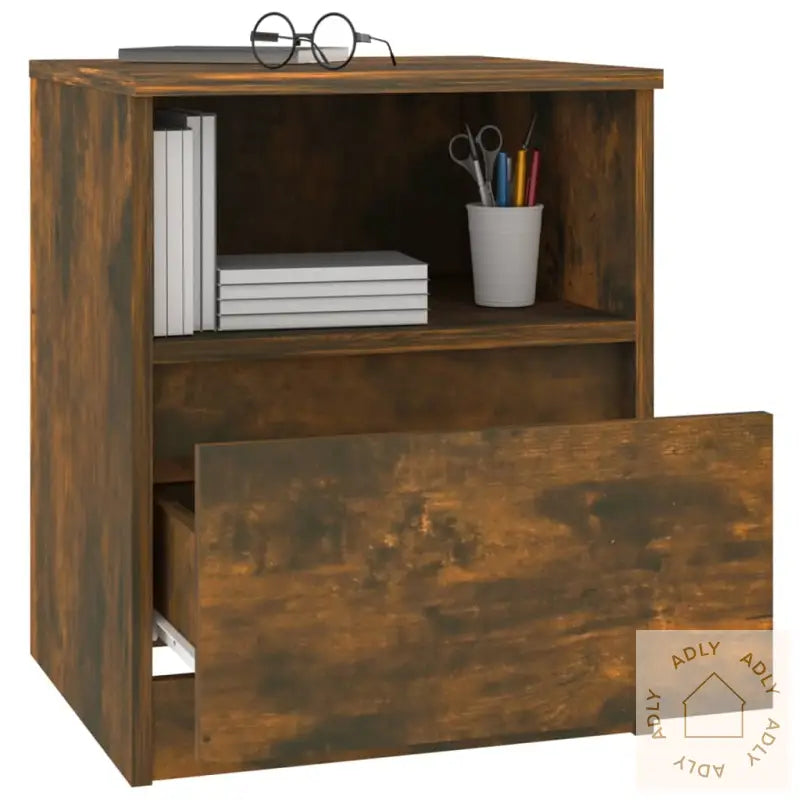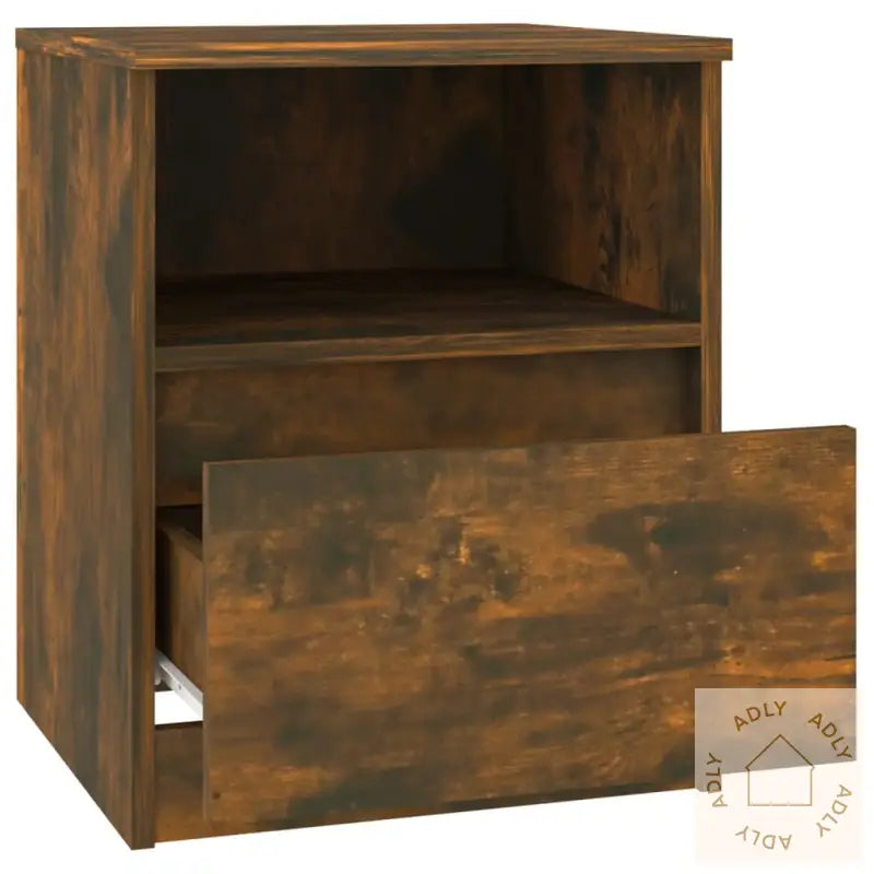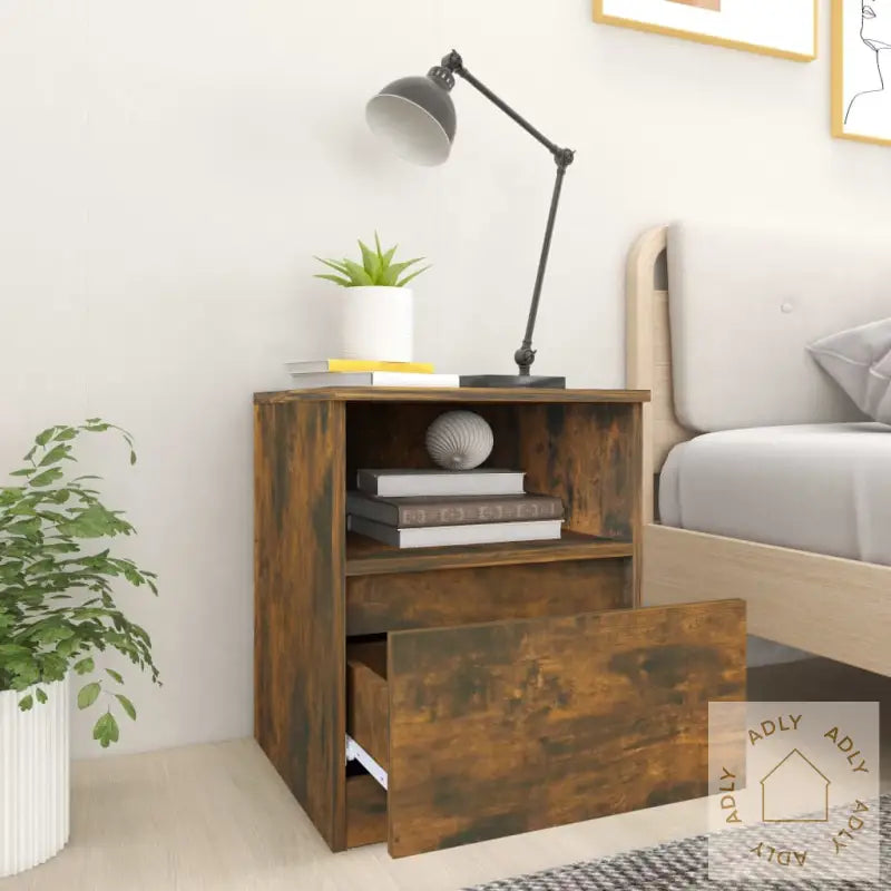Premium materiale: Nattbordet er laget av konstruert treverk som ikke bare ser stilig ut med en glatt overflate, men også gir høy styrke, stabilitet og beskyttelse mot fuktighet. Dette gir deg slitesterke møbler som holder seg fine lenge, både på soverommet og som ekstra skap på andre rom.Rikelig med lagringsplass: Med én romslig skuff og ett åpent rom får du enkelt plass til å organisere alt fra magasiner og bøker, til fjernkontroller og smånips – akkurat der du trenger det.Multifunksjonelt skap: Den solide toppen inviterer til personlig preg, hvor du kan vise frem dekorative detaljer, bilder eller grønne planter. Dette nattbordet kan også brukes som sideskap ved sofaen – et smart supplement til både soveromsmøbler og ellers blant hagemøbler eller utendørsmøbler på overbygget terrasse.ADVARSEL;