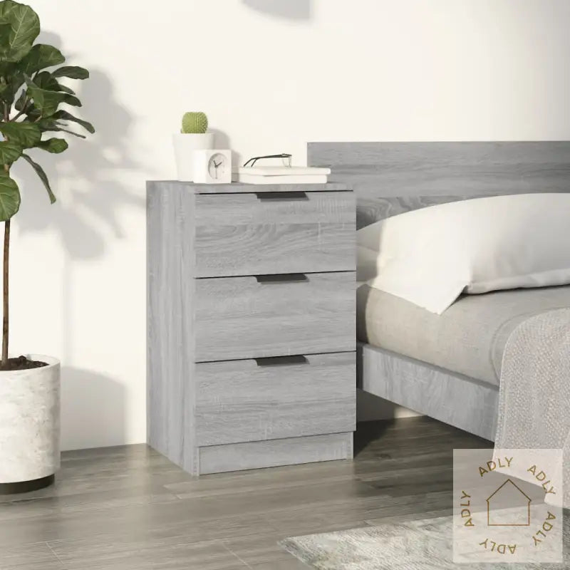 Stabilt materiale: Laget av konstruert tre av høy kvalitet, har nattbordet en jevn og stilig overflate samtidig som det er robust og motstandsdyktig mot fukt, noe som sikrer lang levetid.Rikelig med oppbevaringsplass: Tre romslige skuffer gir deg god plass til alt fra bøker og elektronikk til småting, slik at du enkelt kan holde orden ved sengen. Dette nattbordet er derfor et godt supplement til både bokhyller og stående hyller når det kommer til å organisere soverommet ditt.Solid topp: Den stabile toppen gir deg en fin mulighet til å vise frem dekor, fotorammer eller grønne planter — perfekt for å sette et personlig preg på rommet.Med sitt tidløse design og den elegante grå eikefinishen glir dette nattbordet lett inn med øvrige møbler i huset, og gir fleksible bruksområder også utenfor soverommet om ønskelig.