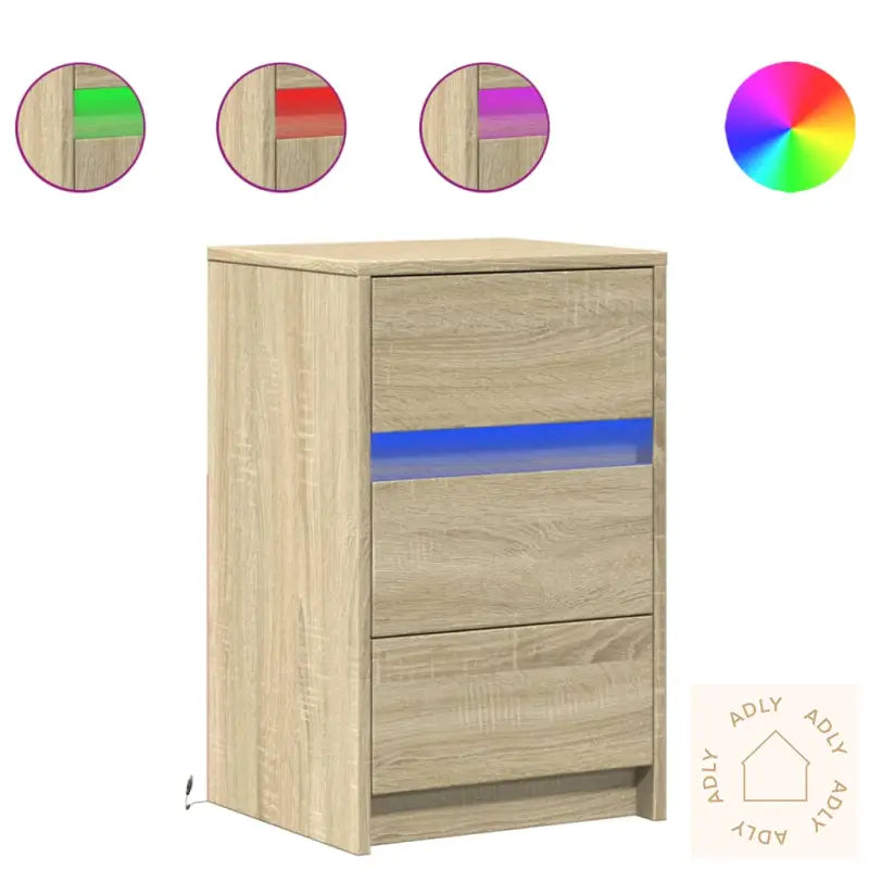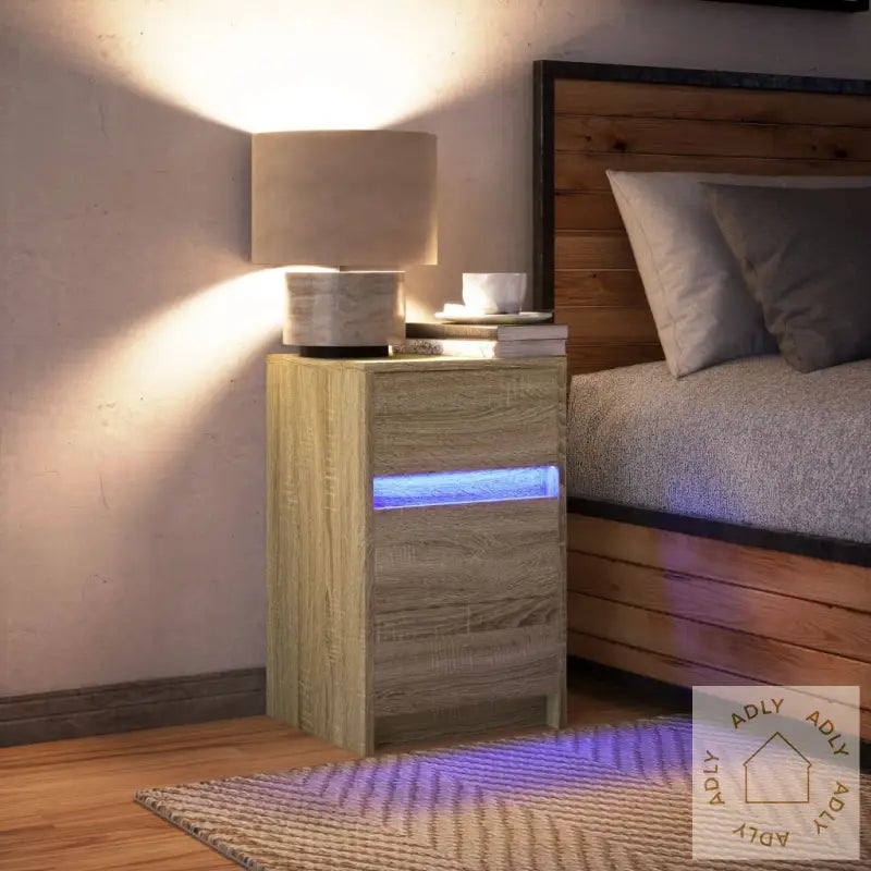Holdbart materiale: Laget av høykvalitets konstruert tre, som ikke bare gir en glatt overflate, men også styrke, stabilitet og effektiv motstand mot fuktighet. Dette gjør at du kan stole på nattbordets lange levetid og solide kvalitet.Rikelig med oppbevaringsplass: Nattbordet tilbyr flere praktiske oppbevaringsmuligheter slik at du alltid har dine viktigste eiendeler innen rekkevidde og organisert. Ideelt for bøker, telefon eller andre nødvendigheter du trenger lett tilgjengelig.RGB LED-lys for en hyggelig atmosfære: De innebygde LED-lysene lar deg enkelt justere både modus, farger og lysstyrke. Skap det perfekte stemningslyset uansett om du vil slappe av eller lese – personaliseringen gir hjemmet ditt et eksklusivt preg.Enkelt å vedlikeholde: Takket være den glatte overflaten er nattbordet lett å holde rent. Bare tørk av med en fuktig klut når det trengs, og nyt et pent og velstelt møbel med minimal innsats.Advarsel: