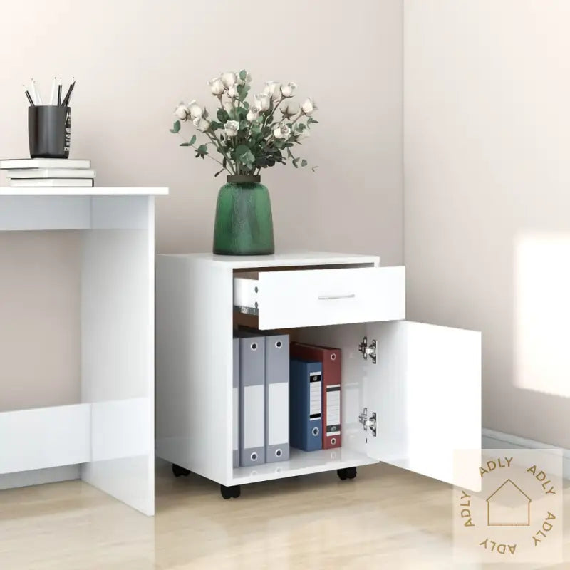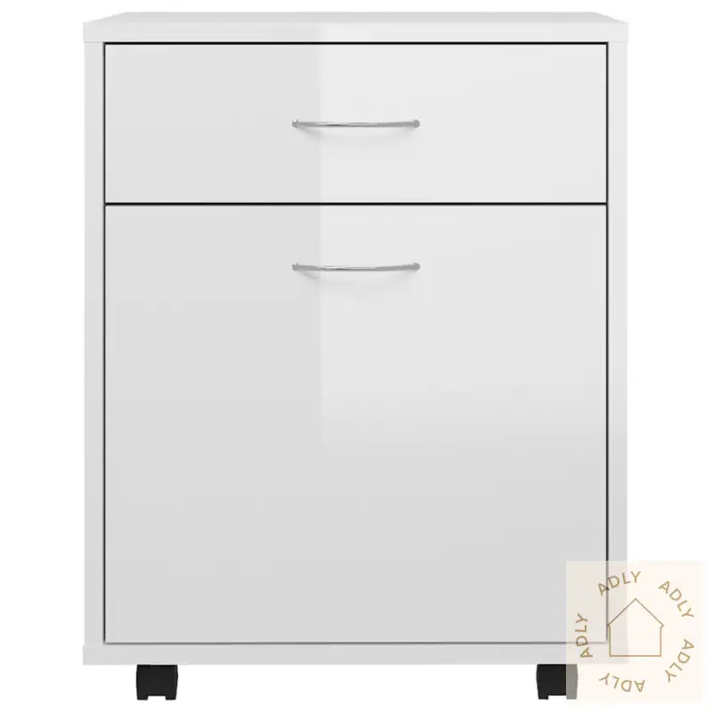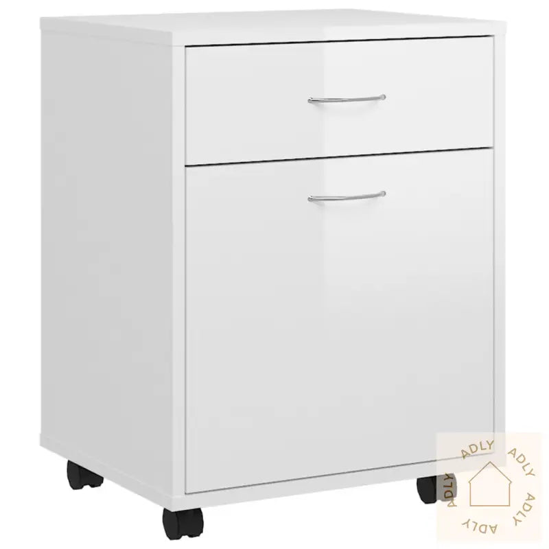 Farge: høyglans hvitMateriale: konstruert treMål: 45 x 38 x 54 cm (B x D x H)Enkel å rulle med 4 hjul (2 av dem låsbare)Montering kreves: ja