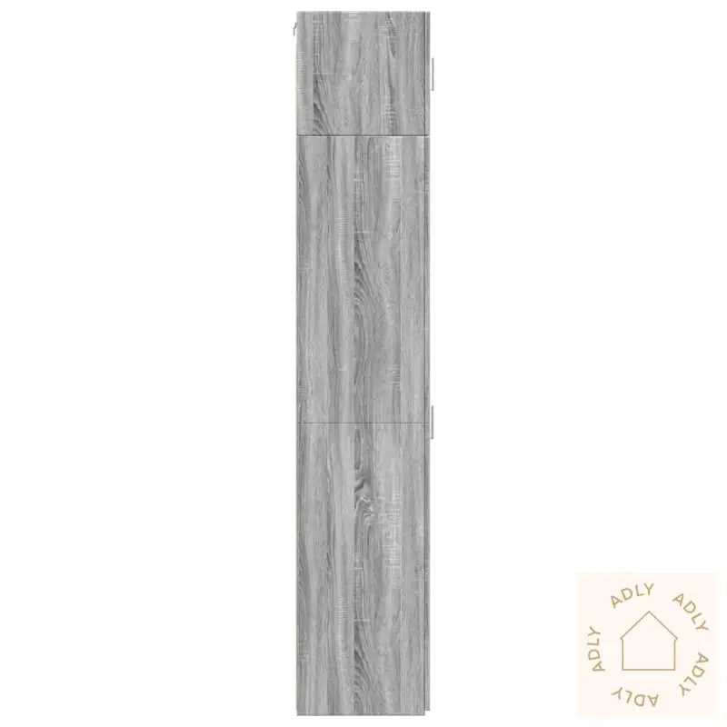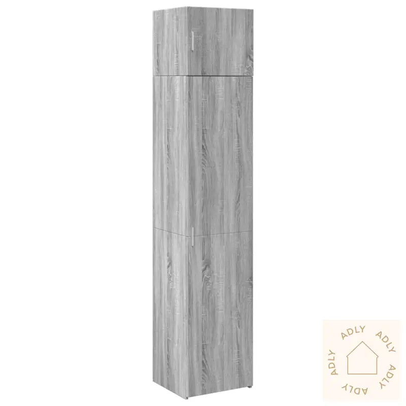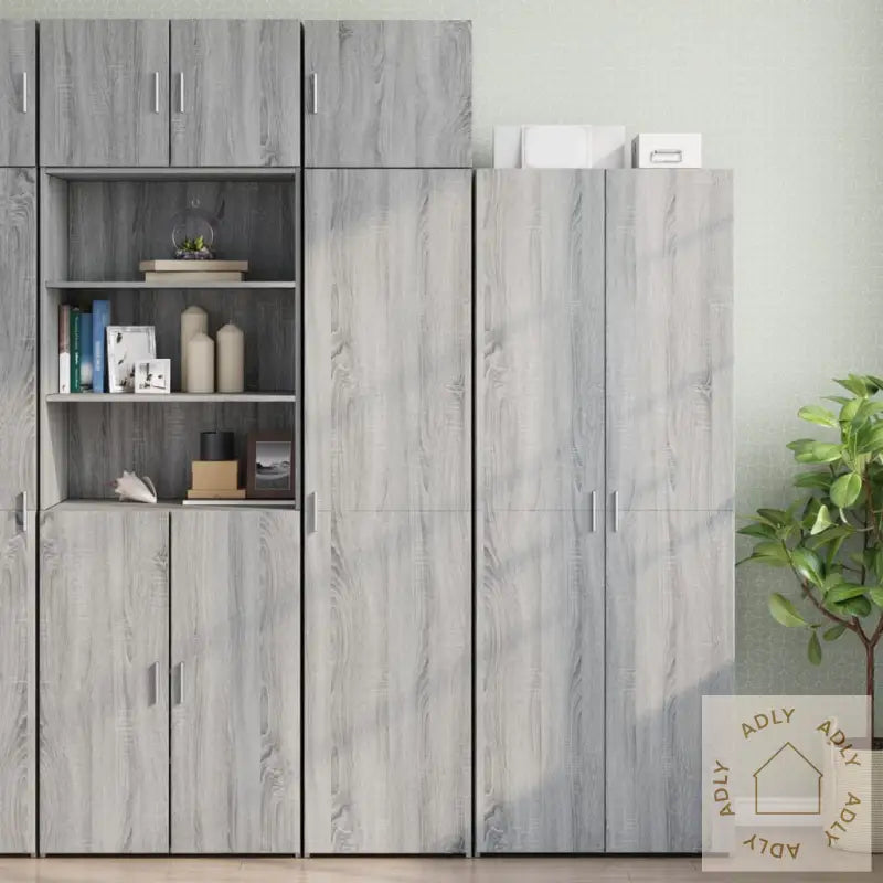 Skruer og plugger til veggmontering følger ikke med. Velg alltid skruer og plugger som er riktig for veggen din – spør gjerne en fagperson ved usikkerhet. Husk å følge monteringsanvisningen nøye for å få best mulig resultat.Farge: grå sonomaMateriale: konstruert treSamlet mål: 45 x 42,5 x 225 cm (B x D x H)Mål lite skap: 45 x 42,5 x 40 cm (B x D x H)Mål stort skap: 45 x 42,5 x 185 cm (B x D x H)Antall rom: 8Montering kreves: ja